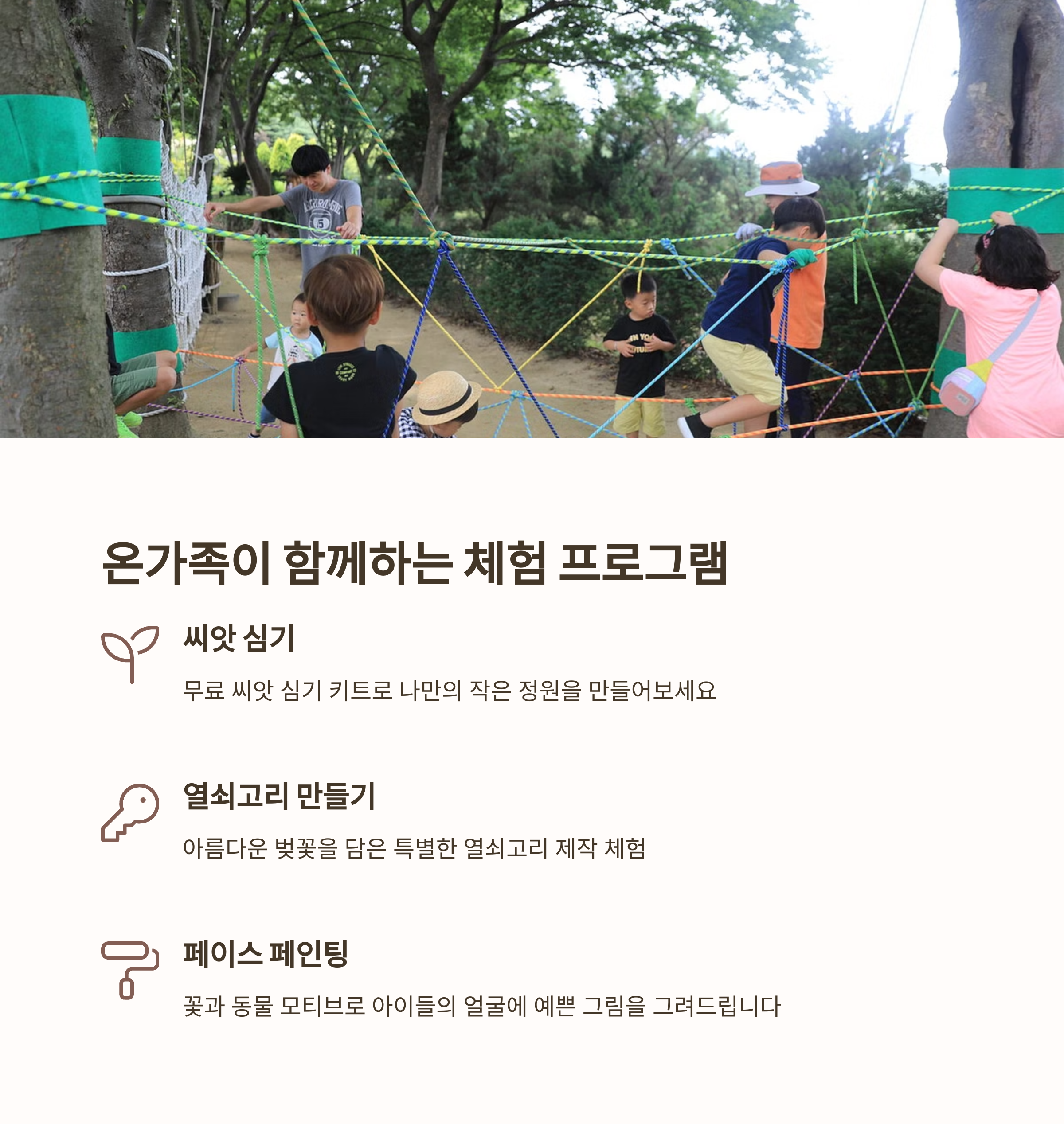 축제 기간 중에는 주말마다 다양한 체험 부스도 운영 중입니다. 씨앗심기, 나만의 열쇠고리 만들기, 페이스페인팅 등 어린이도 어른도 함께 참여할 수 있는 가족 체험 프로그램이 수목원 내부와 잔디광장 일대에서 진행돼요. 특히 아이들을 위한 곰사원 관람, 미니트레인 체험도 인기가 많습니다.