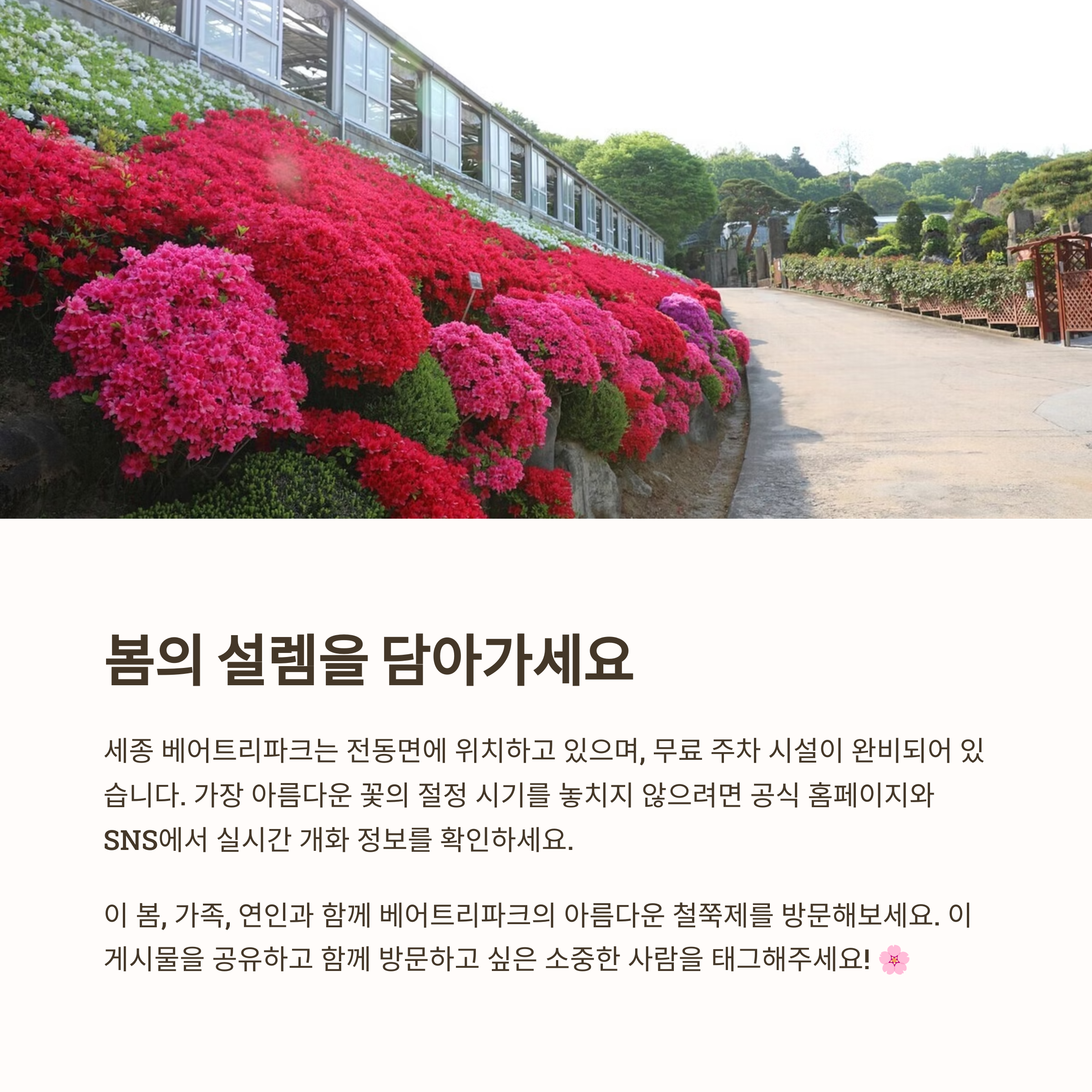세종 베어트리파크의 철쭉길은 완만한 언덕길과 산책로를 따라 선홍빛 철쭉이 연이어 피어 수목원 전체가 붉게 물든 듯한 장관을 연출합니다. 조경 화단, 분재원, 곰사원 가는 길 등 곳곳에서 다양한 색감의 철쭉을 만날 수 있으며, 사진 찍기 좋은 포인트도 많아 봄날 인생샷을 남기기 제격이에요.