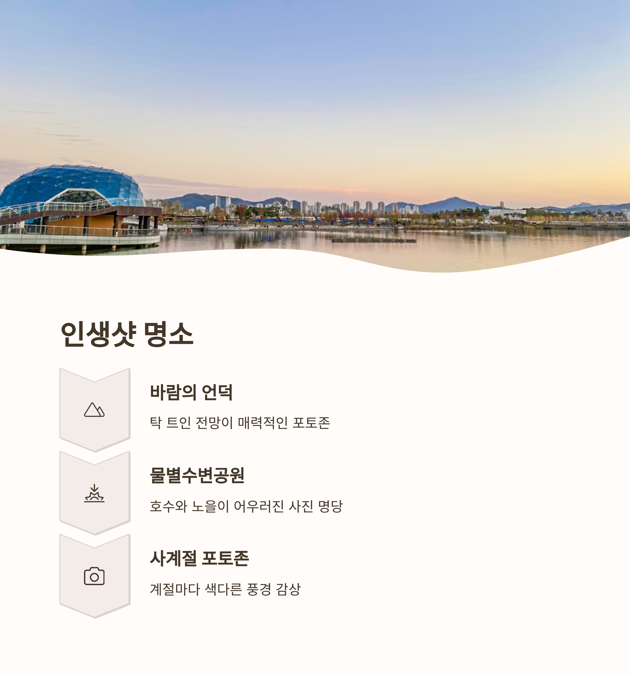 세종 호수공원은 텐트는 설치 불가하지만, 돗자리와 간단한 먹거리로 즐기는 피크닉에는 최적의 장소입니다. 자전거를 활용한 움직이는 데이트 코스는 산책보다 더 넓은 영역을 체험할 수 있고, 포토존을 따라가다 보면 자연과 도시가 어우러진 뷰를 마주할 수 있습니다. 날씨가 좋은 날엔 도서관 잔디밭 → 자전거 데이트 → 물별수변공원 노을 구경 코스를 추천드립니다.