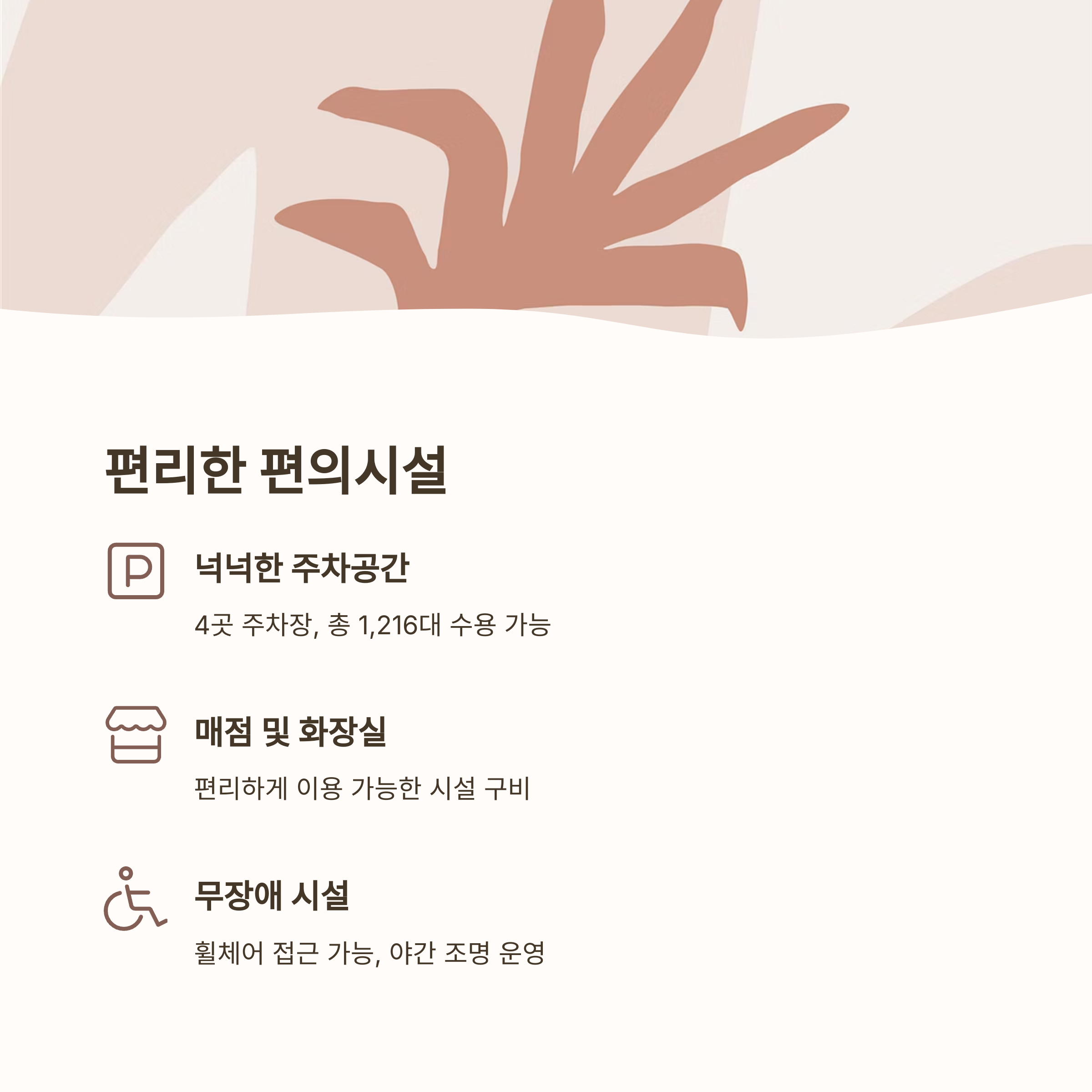 호수공원 주변에는 공영주차장이 여러 곳 있어 평일은 여유롭고, 주말에는 다소 혼잡할 수 있으므로 오전 방문을 추천드립니다.