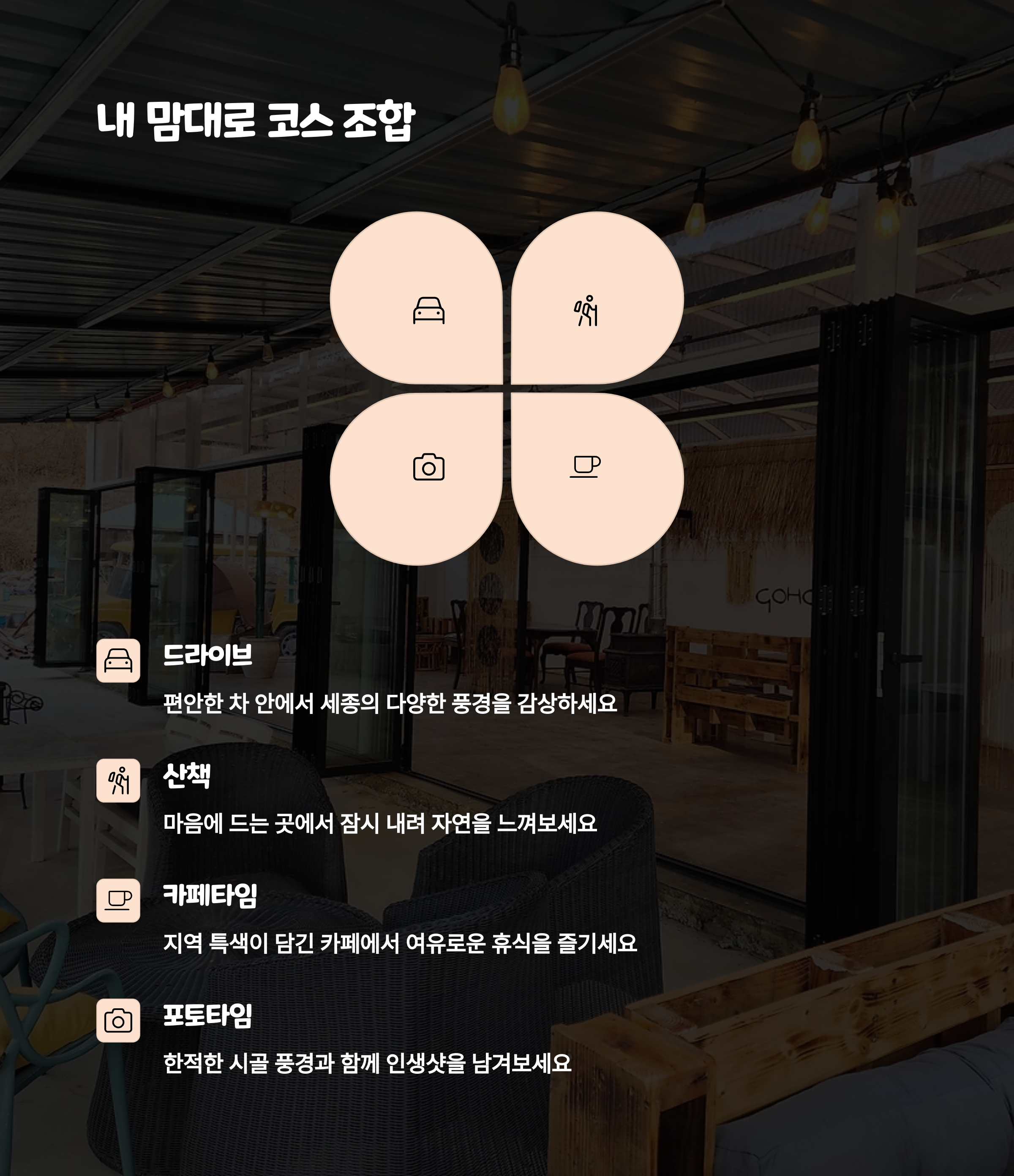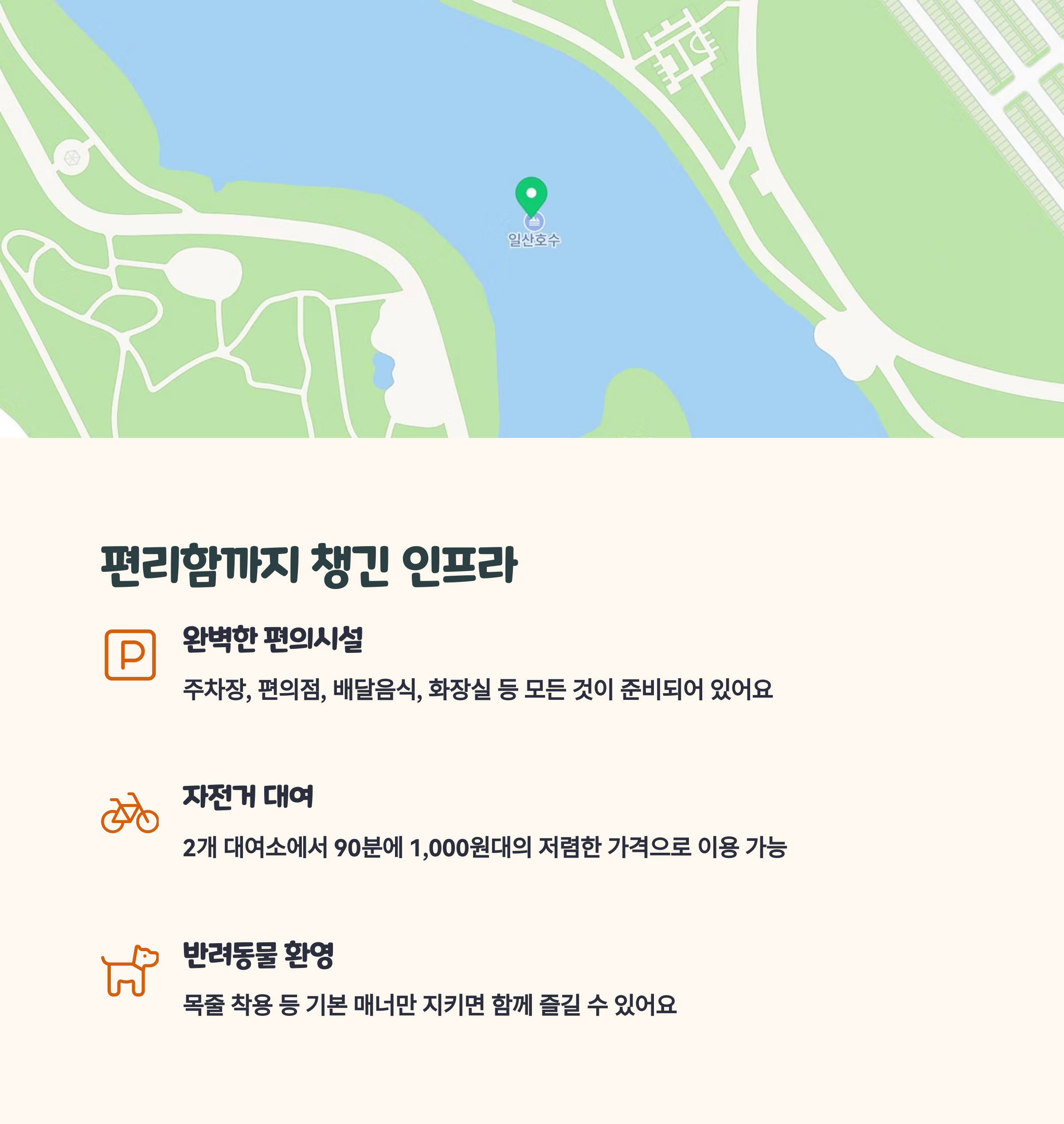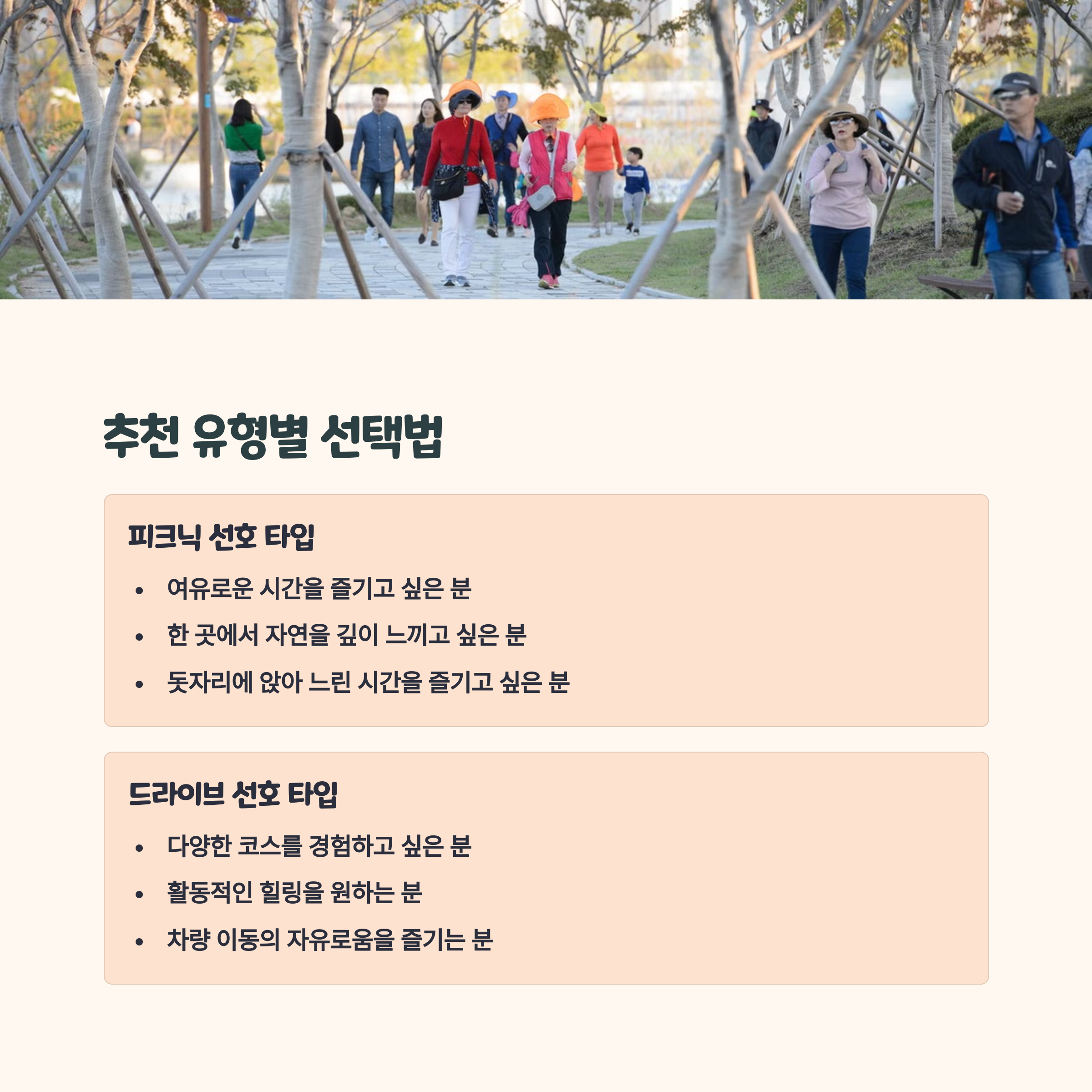 | 추천 타입 | 피크닉: 느긋한 쉼, 도심 속 힐링 / 드라이브: 활동적인 경로, 자연 속 자유로움 |
