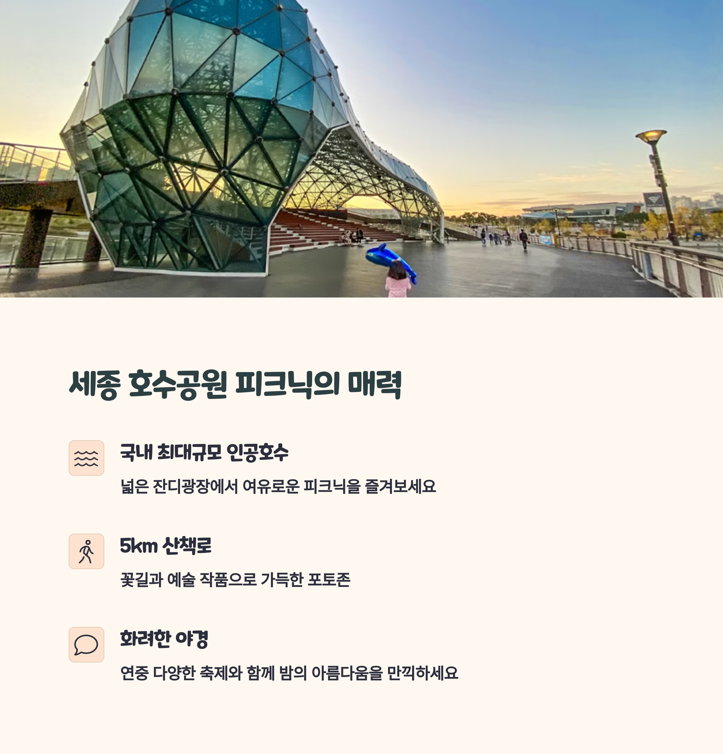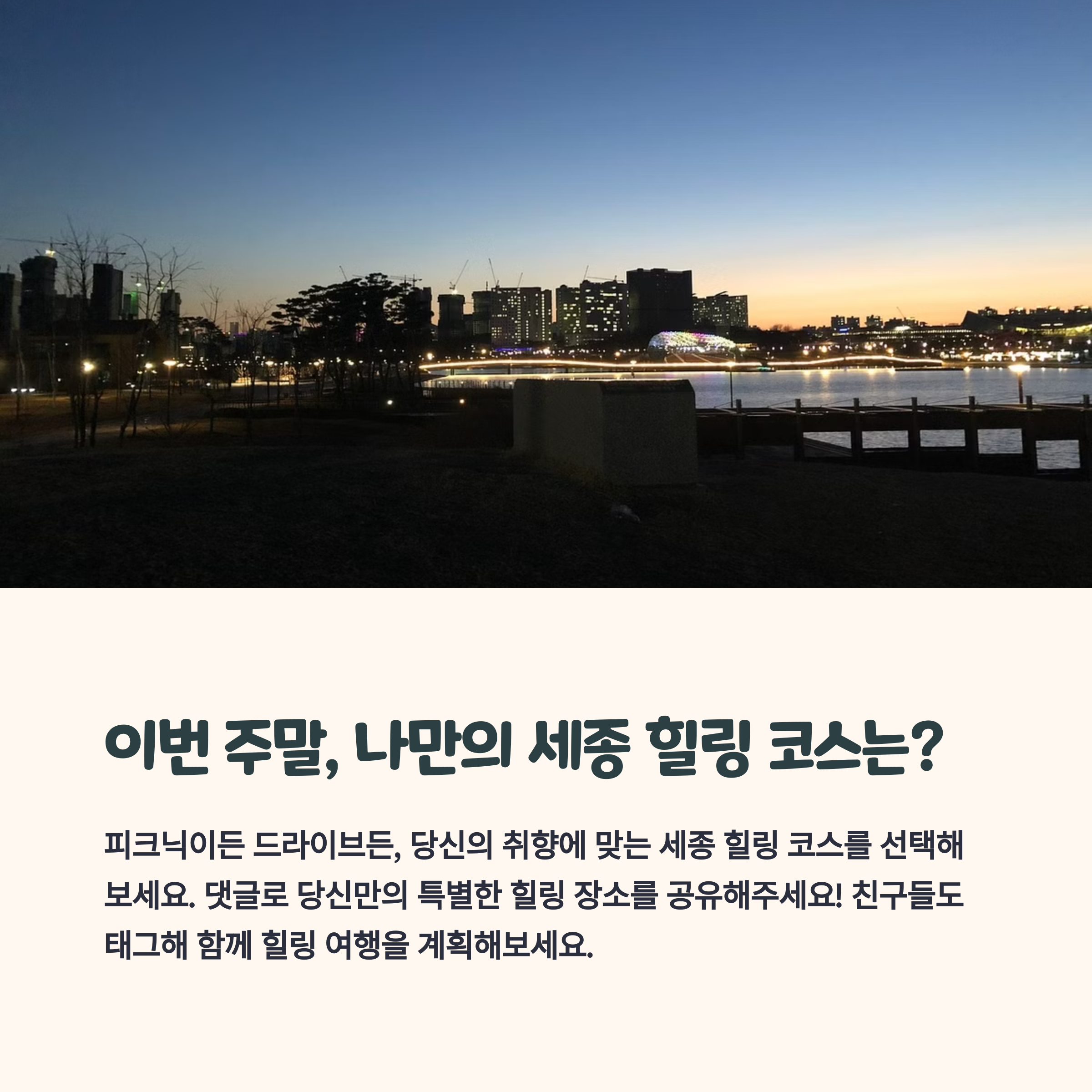 세종에서 추천하고 싶은 피크닉 장소나 드라이브 코스가 있다면 댓글로 함께 나눠주세요! 나만 아는 힐링 포인트, 기다리고 있어요 :)