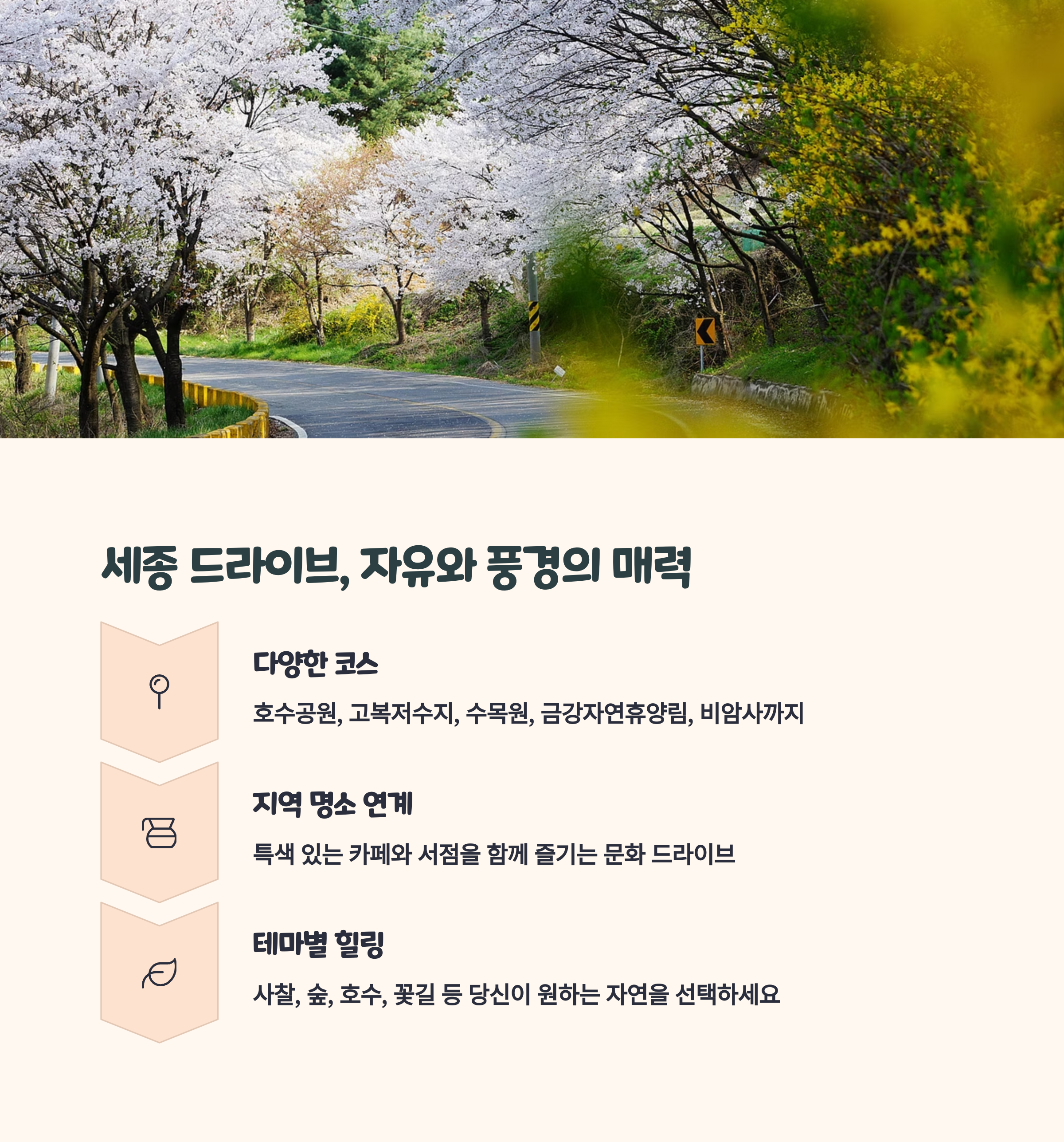 세종의 봄은 피크닉도 좋고, 드라이브도 좋은 계절입니다. 여유롭게 잔디 위에서 쉬며 힐링하고 싶다면 호수공원, 다양한 자연과 감성 스팟을 순회하며 리프레시하고 싶다면 드라이브로 당신의 주말을 더 멋지게 만들어보세요!