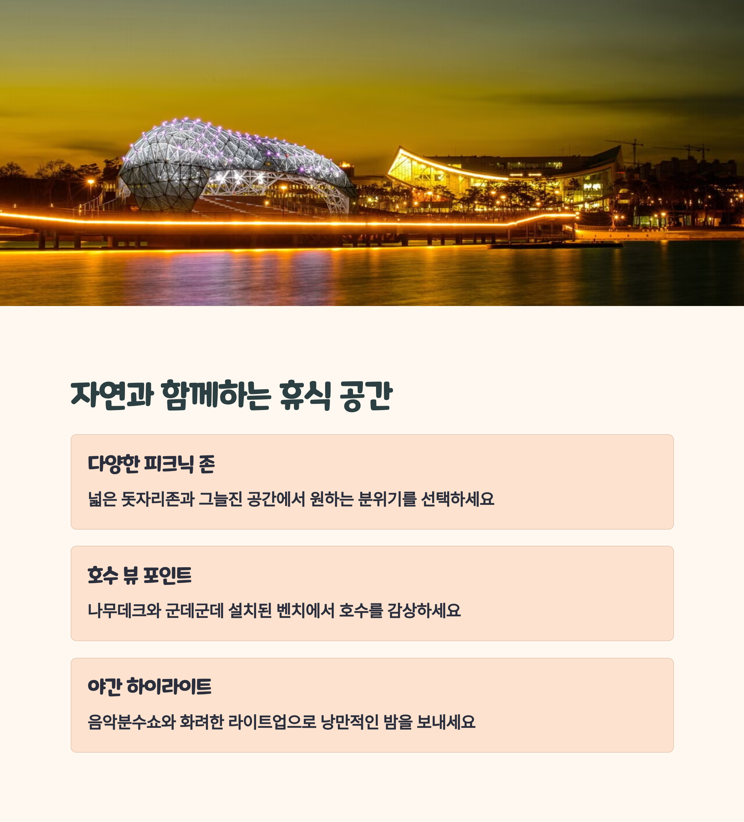 피크닉은 짐이 간단하고 가볍게 휴식하기 좋은 코스, 드라이브는 장소를 이동하며 다양한 분위기를 경험할 수 있어 원하는 분위기에 따라 선택이 달라져요. 도심형 힐링 → 호수공원, 자연 속 변화무쌍한 여정 → 드라이브 코스로 정리할 수 있습니다.