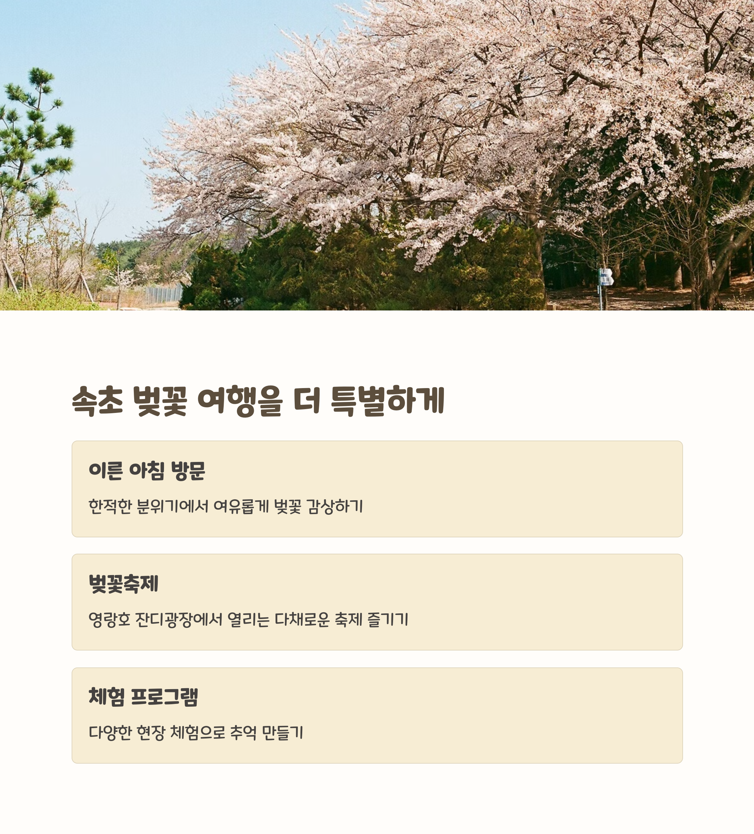속초 벚꽃 여행을 다녀오신 분들의 꿀팁이나 추천 명소가 있다면 댓글로 남겨주세요! 다른 여행자들에게 큰 도움이 될 수 있습니다.