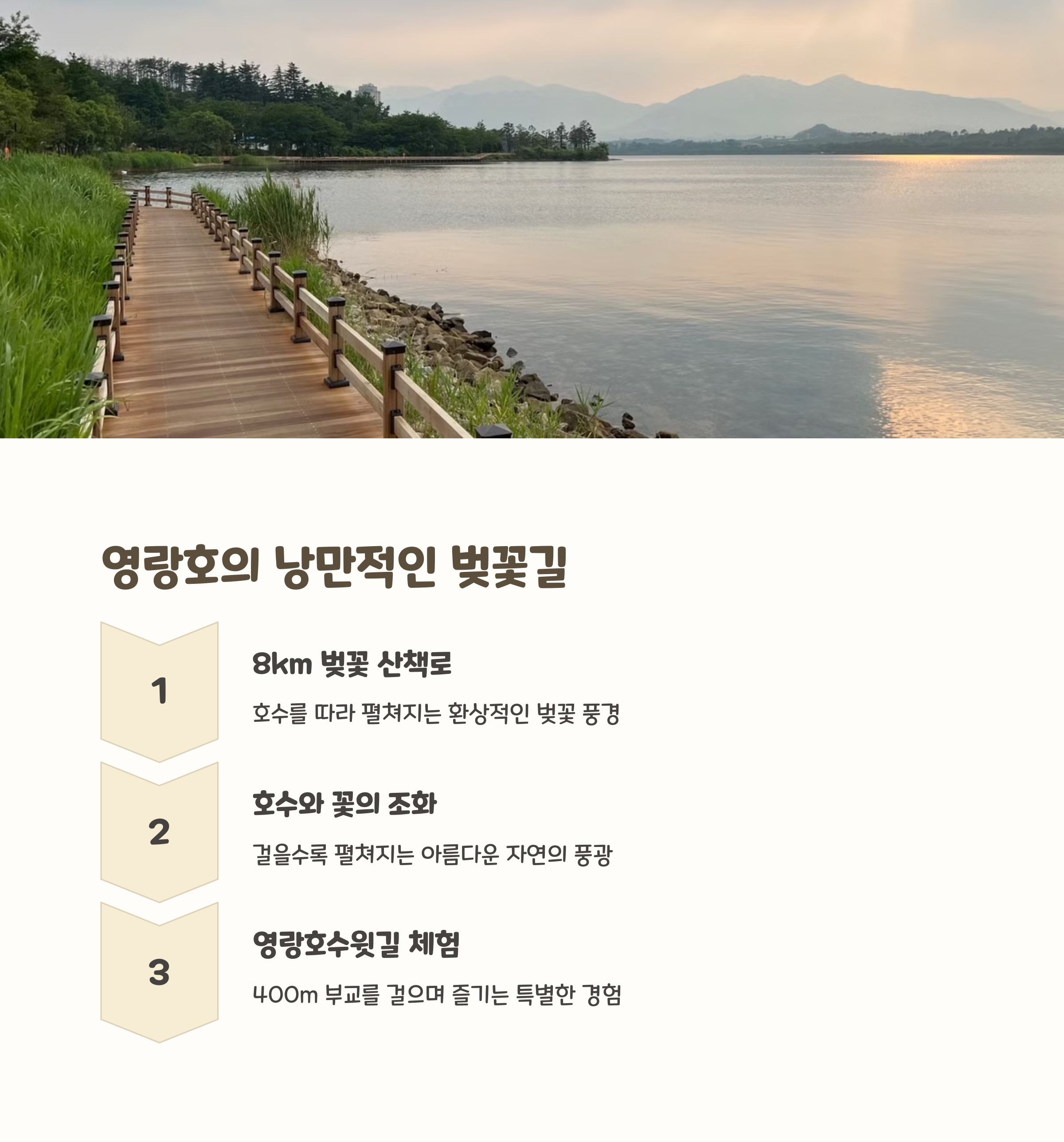 8km 산책로, 벚꽃과 호수 경관 호수에 비친 벚꽃 풍경이 아름다움 설악산과 벚꽃을 동시에 즐기는 드라이브