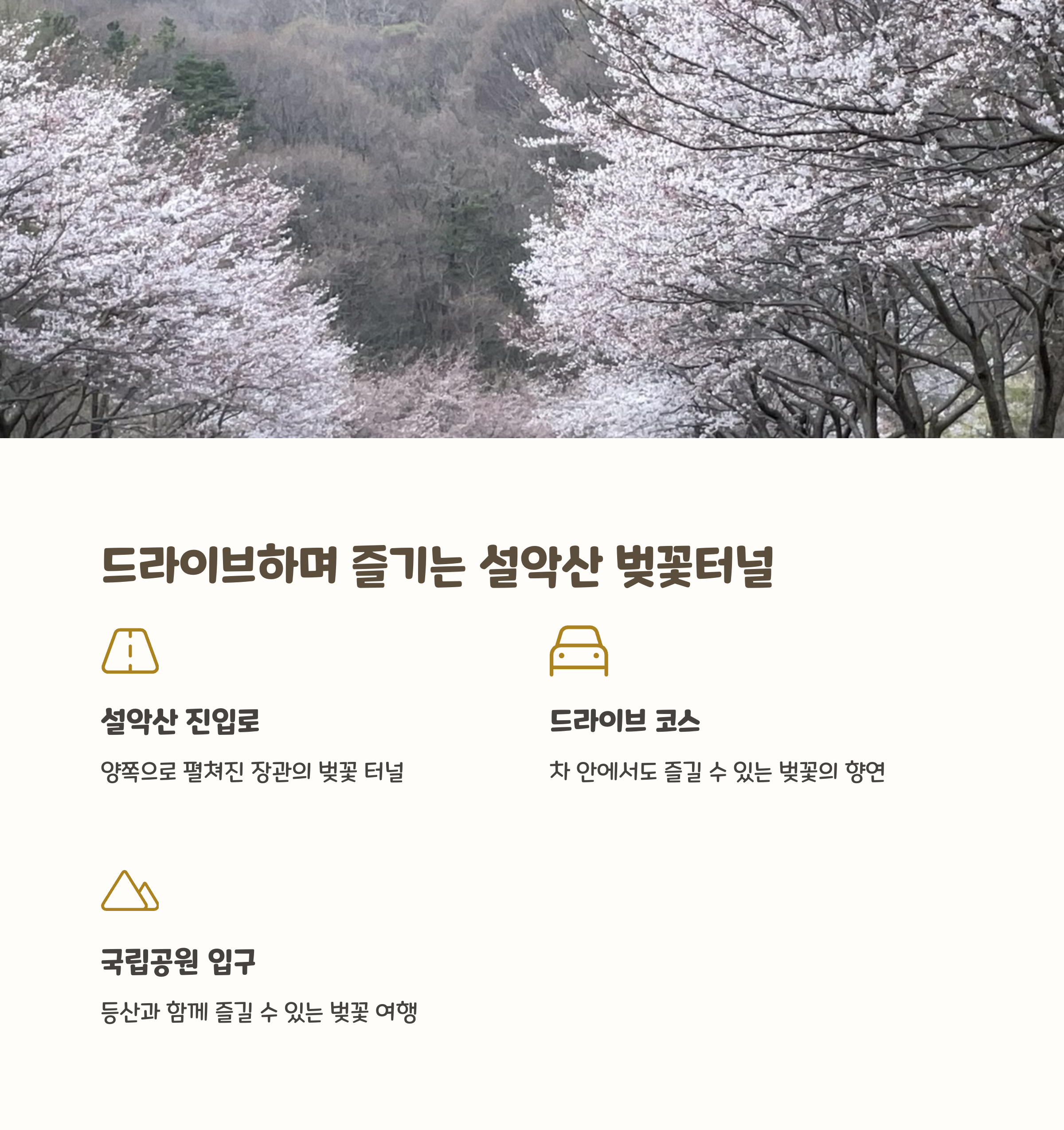 또 다른 벚꽃 명소인 설악산 벚꽃터널은 드라이브 코스로 인기가 높으며, 설악산 진입로를 따라 벚꽃이 아름다운 터널을 이룹니다. 벚꽃과 함께 설악산 국립공원 입구까지 이어지는 드라이브를 즐기면서 자연의 경치를 만끽할 수 있습니다. 이 루트는 벚꽃과 자연을 동시에 즐기기 좋은 여행 코스로 추천됩니다.