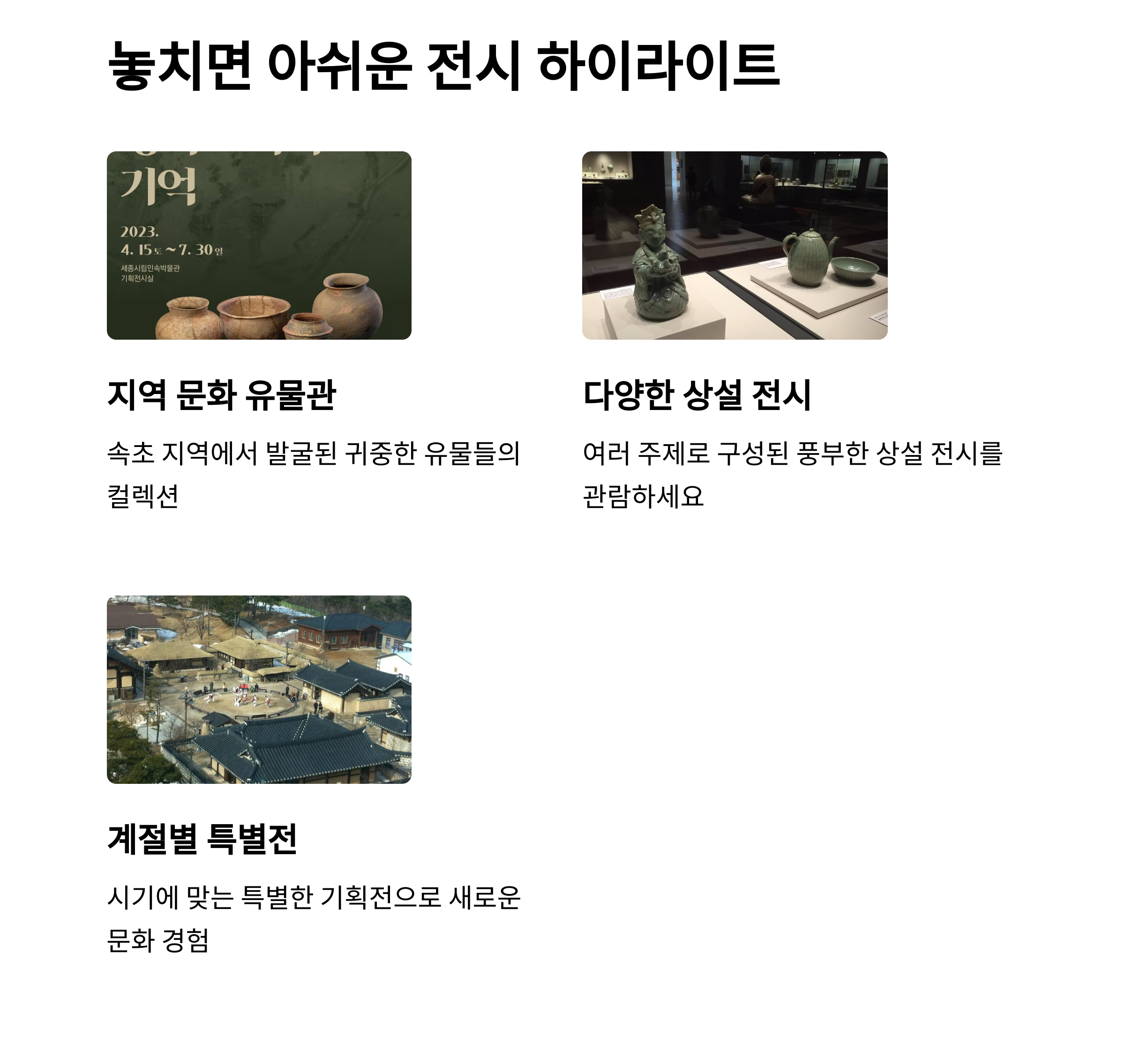 관람 시간과 입장료는 박물관 공식 홈페이지 참고 계절별 테마 프로그램도 정기적으로 열립니다. 속초 해수욕장, 영랑호 등 인근 명소도 인기입니다.