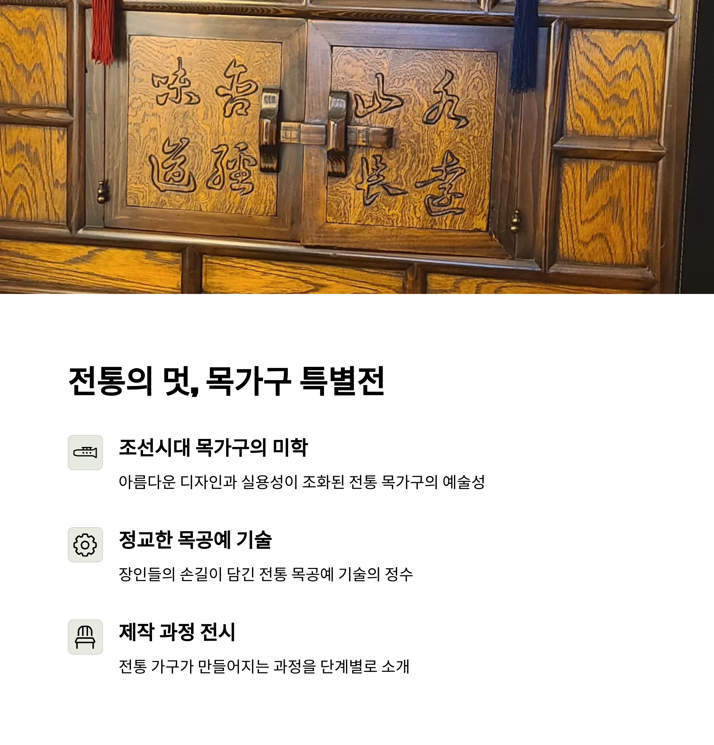 특별전 '전통의 멋, 목가구'는 전통 목가구의 아름다움과 실용성을 동시에 보여주는 전시로, 고풍스러운 디자인과 장인의 섬세한 손길이 살아있는 작품들을 만나볼 수 있습니다. 이 전시는 단순한 감상에서 그치지 않고, 문화재로서의 가치를 되새기게 하는 교육적인 시간도 제공합니다. 아이들에게는 전통 공예의 정수를, 어른들에게는 향수를 불러일으키는 시간이 될 것입니다.