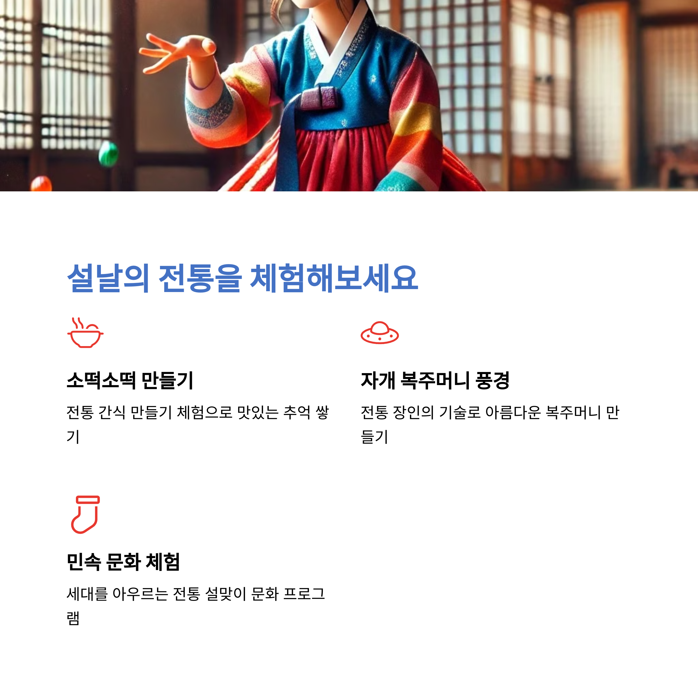 | 전통문화 체험 | 설날을 맞아 전통 자개 복주머니 만들기 등 체험 제공 |