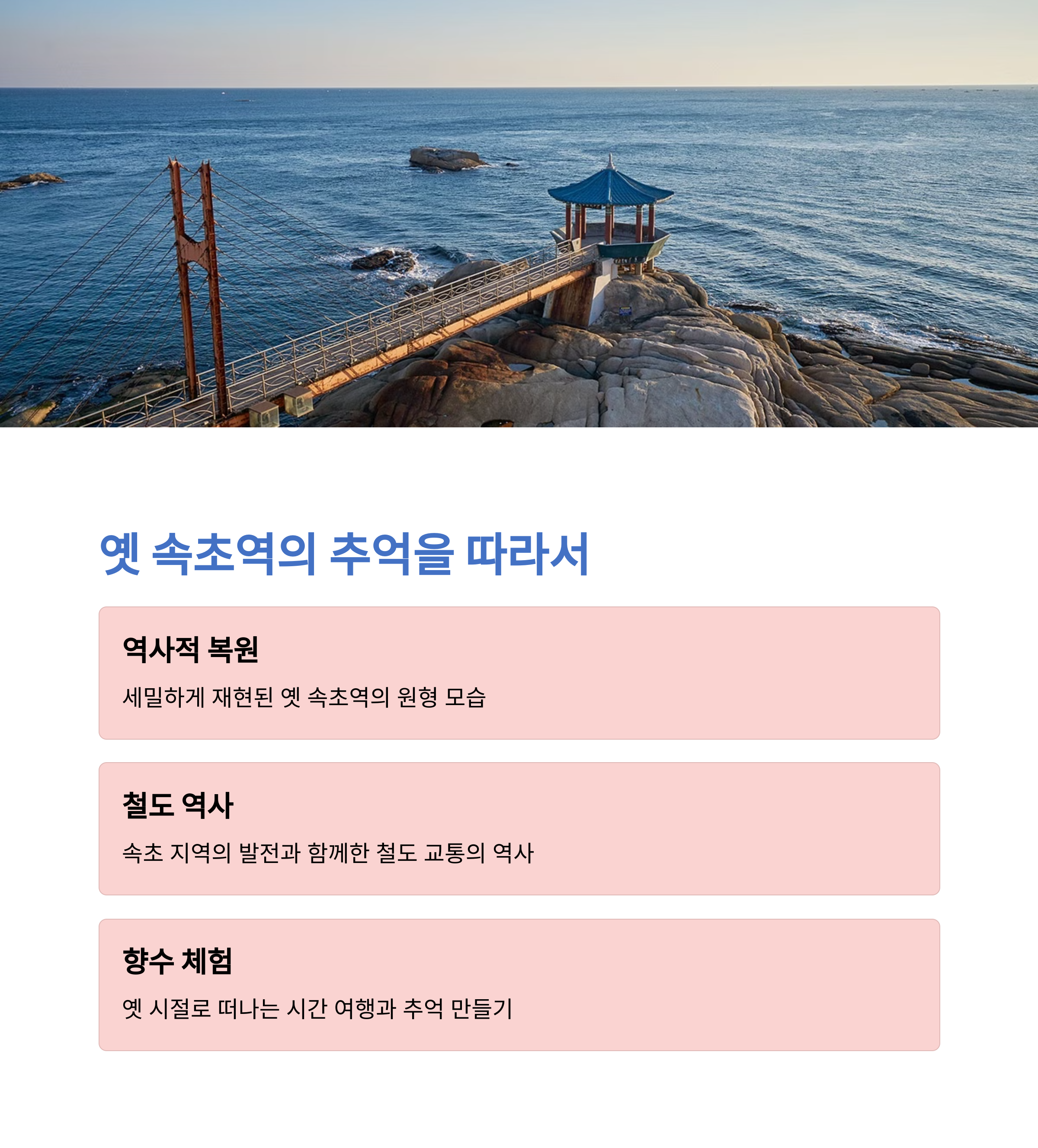 박물관 야외에는 복원된 옛 속초역사도 자리하고 있어, 과거 속초의 모습을 직접 보고 느낄 수 있는 특별한 공간이 마련되어 있습니다. 복원된 역사 안에서는 속초의 철도 역사와 그 주변의 문화가 생생하게 전해지며, 이곳을 찾는 이들에게 시간여행 같은 경험을 선사합니다. 이렇듯 속초시립박물관은 단지 과거를 보존하는 장소를 넘어, 속초의 이야기를 살아있는 현재로 끌어내는 역할을 수행하고 있습니다.