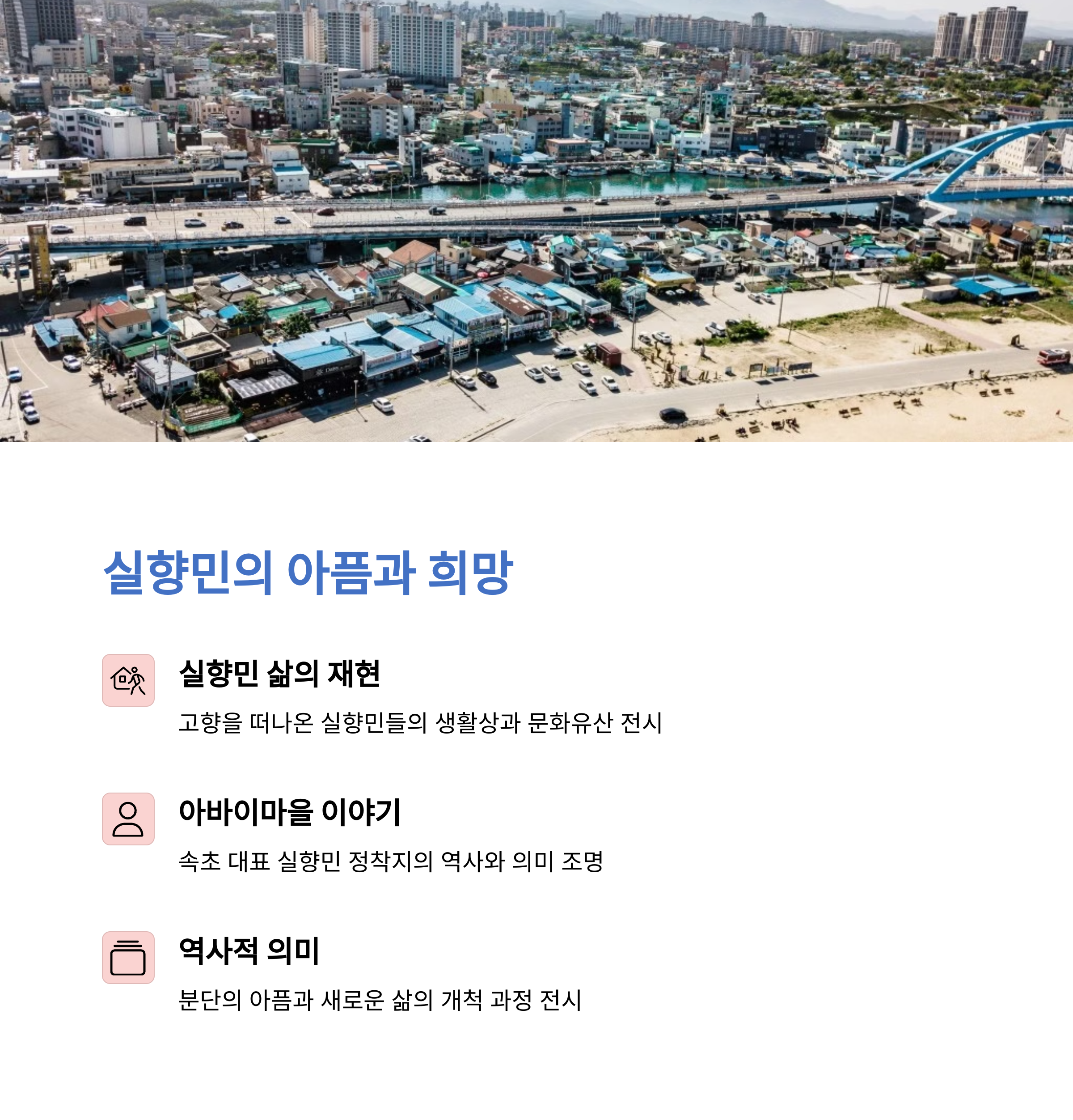 지역의 역사와 문화를 간직한 속초 대표 문화 공간 실향민의 삶과 추억을 담은 다양한 유물 전시 설날 행사 등으로 전통을 체험할 수 있는 기회 제공