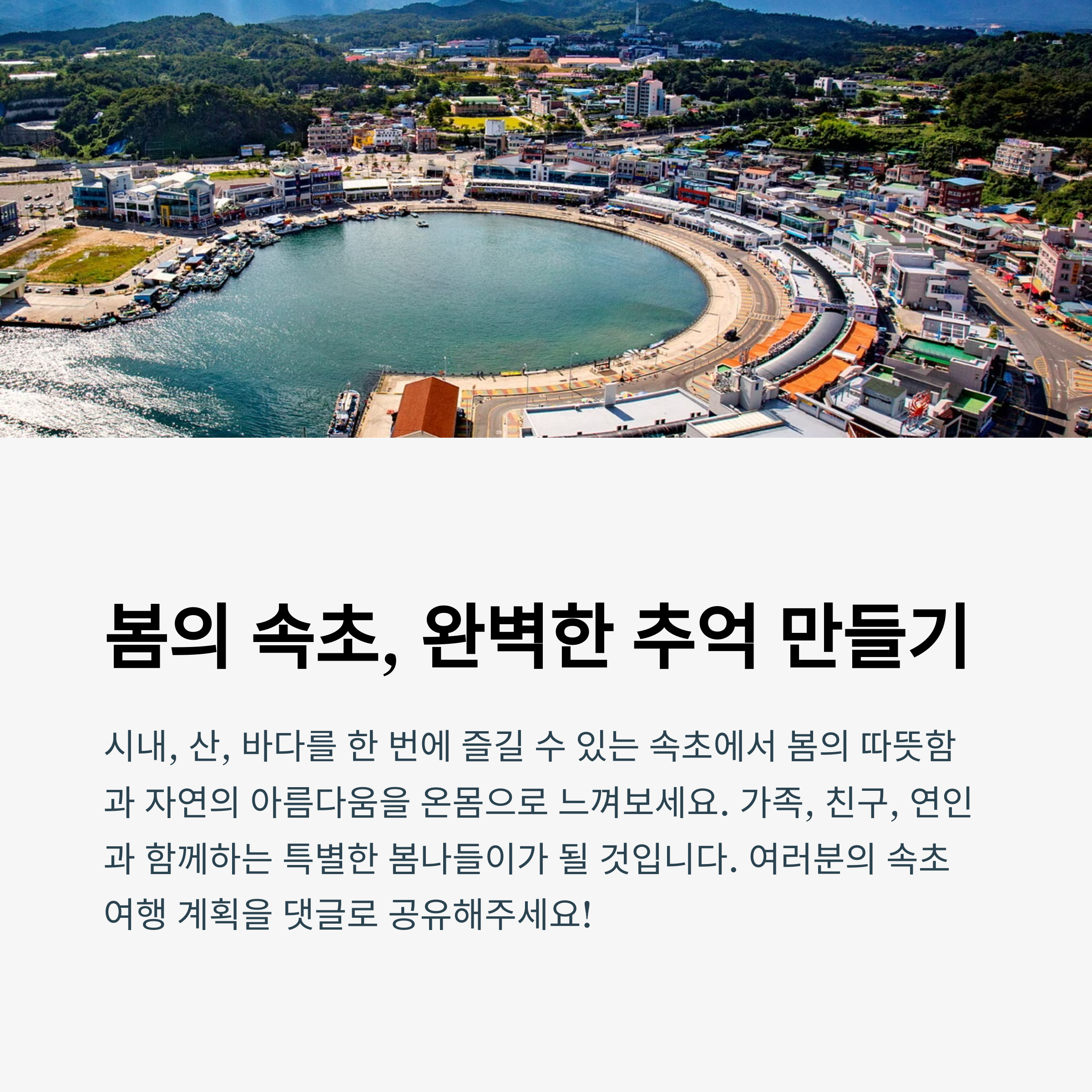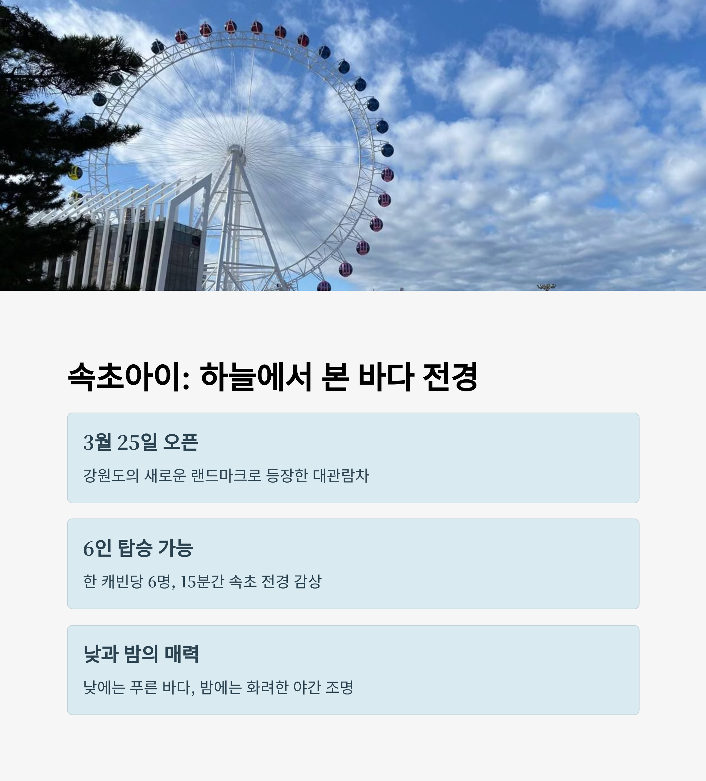 따뜻한 봄 햇살 아래에서 속초의 대표 명소들을 따라 걷는 여행은 자연과 도시, 감성이 어우러진 최고의 코스입니다. 2025년 봄, 속초는 새롭게 문을 연 대관람차 속초아이와 함께 엑스포타워, 청초호, 해수욕장, 대포항까지 매력적인 여행 루트를 완성합니다. 바다를 내려다보며 걷는 산책길과 시원한 전망대, 신선한 해산물 요리까지 하루에 모두 경험할 수 있는 속초 봄 추천 코스를 지금 바로 만나보세요.