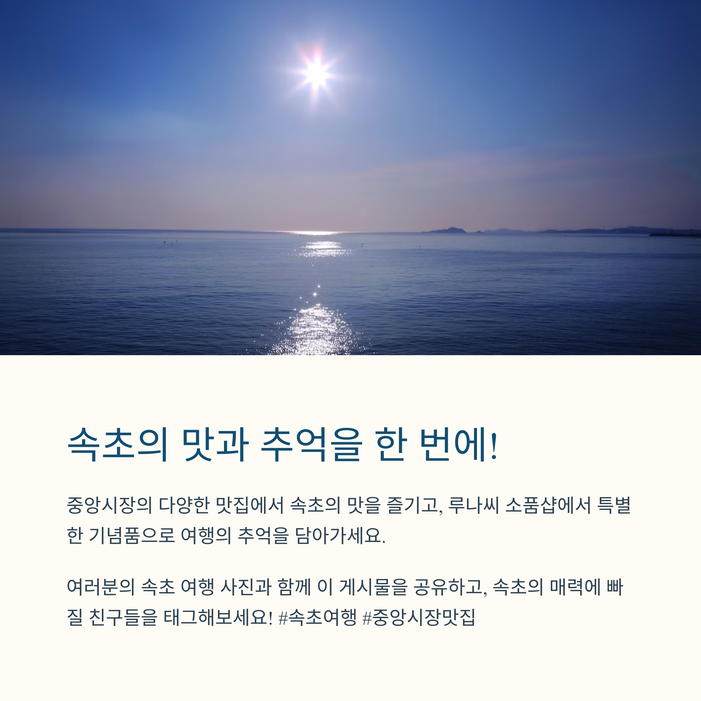 속초 중앙시장과 루나씨 소품샵은 단순한 관광지를 넘어서 현지의 문화와 감성을 체험할 수 있는 최고의 공간입니다. 맛있는 음식을 즐기고, 감성 가득한 기념품을 구매하며 하루를 보내는 것만으로도 속초 여행의 매력을 온몸으로 느낄 수 있습니다. 계획에 꼭 포함해야 할 필수 코스이자, SNS에 공유하고 싶은 포인트가 가득한 여행지입니다.