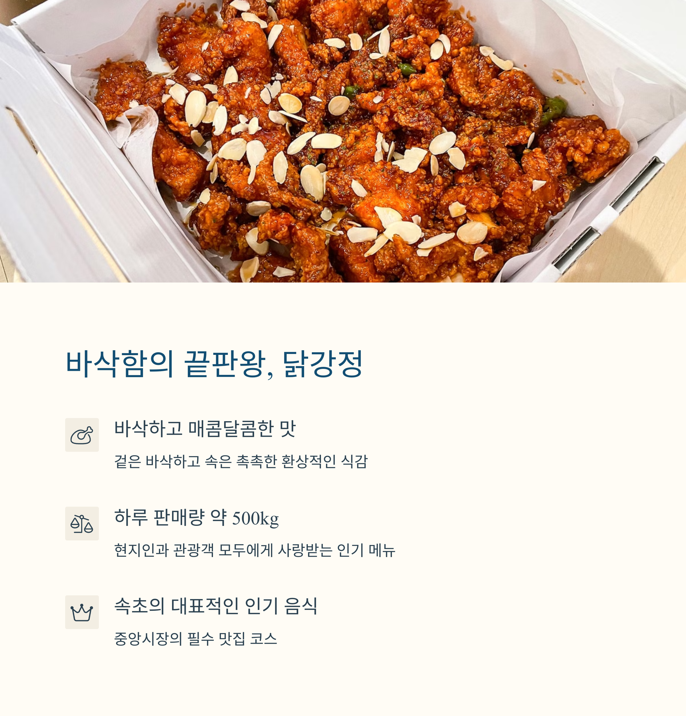 | 닭강정, 해물파전, 순대 등 먹거리 가득 | 감성 기념품으로 여행의 추억을 담다 | 시장 투어 + 소품샵으로 알찬 하루 |