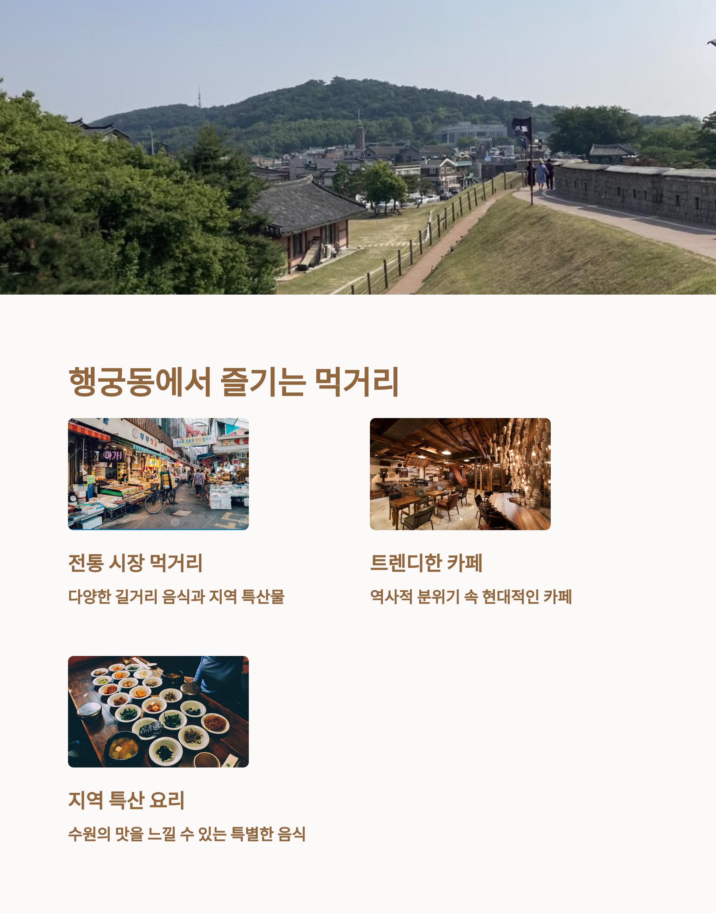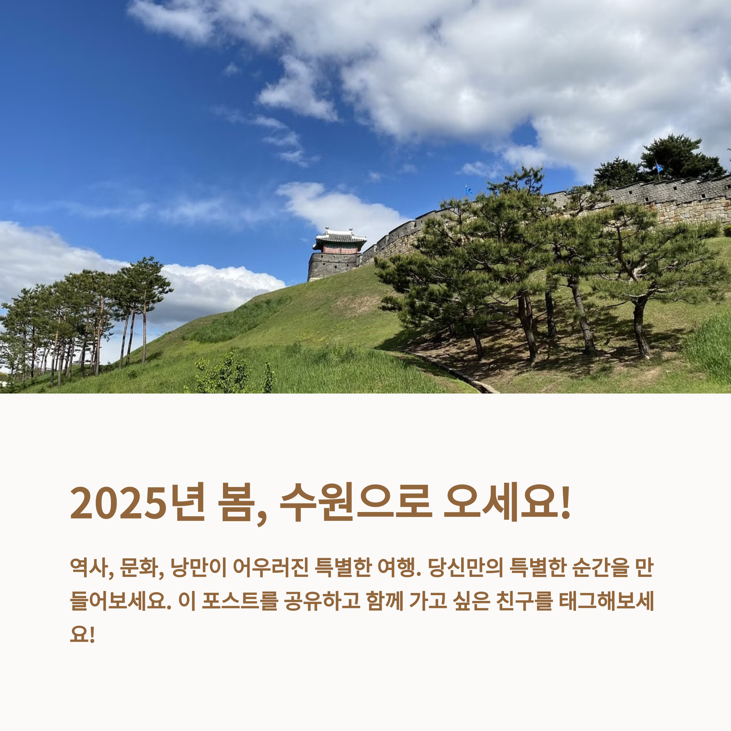 당일치기 여행으로 낮에는 수원화성과 화성행궁을 관람하고, 저녁에는 야간개장을 즐기는 일정은 여행 동선 면에서도 탁월합니다. 주변 행궁동 골목에는 다양한 먹거리와 감성 카페, 전통 디저트 가게 등이 있어, 데이트 코스나 가족 나들이로도 매우 추천할 만합니다. 문화유산과 현대 감성이 어우러진 이 코스는 수도권 내에서 짧은 시간 안에 최고의 만족을 느낄 수 있는 여행지로 손꼽히고 있습니다.