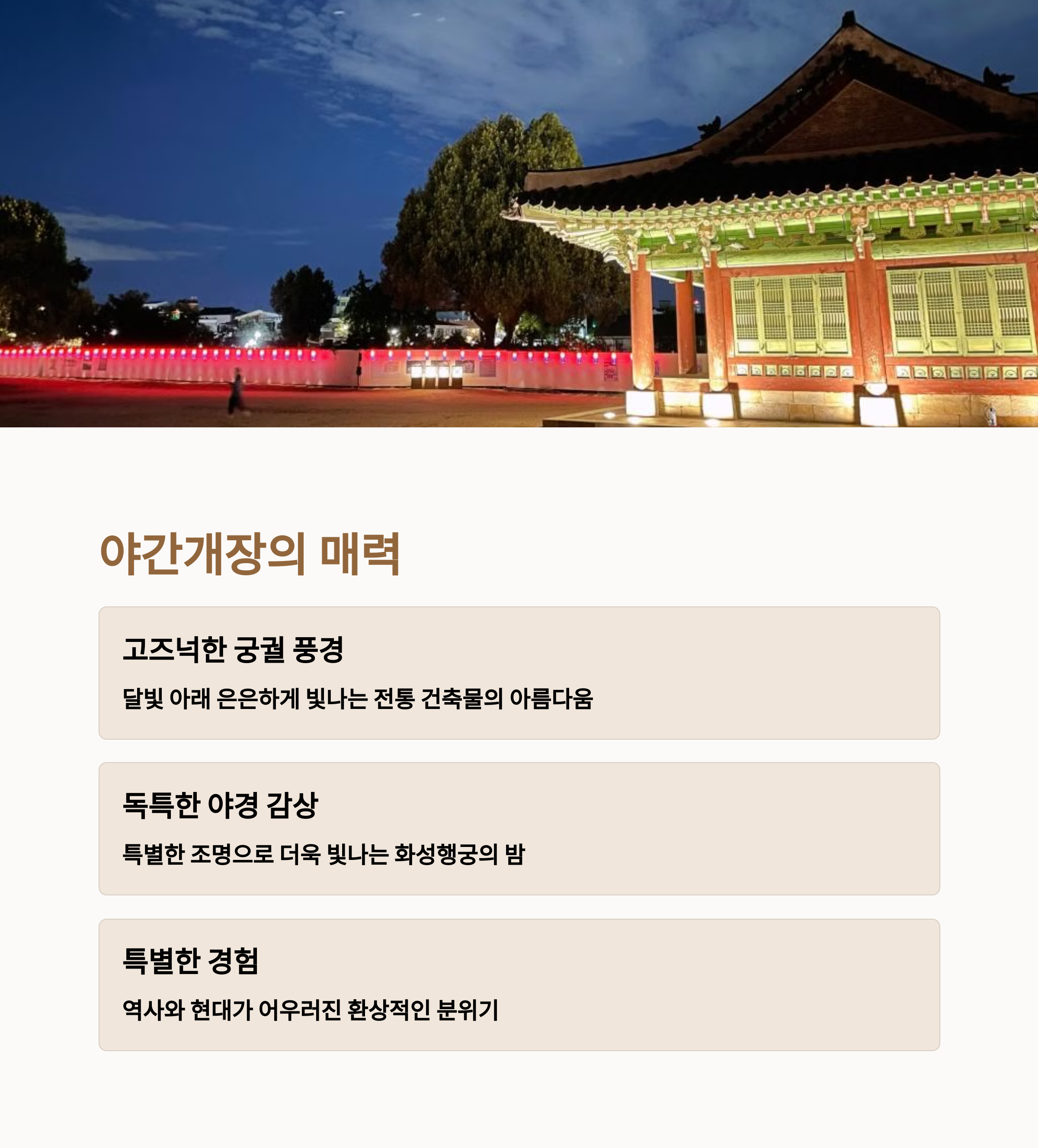 수원화성, 행궁동 등 주변 관광지 풍성 | QR 예매 시스템과 현장 매표 병행 운영 | 야간 조명과 고궁이 어우러진 인생샷 포인트 |