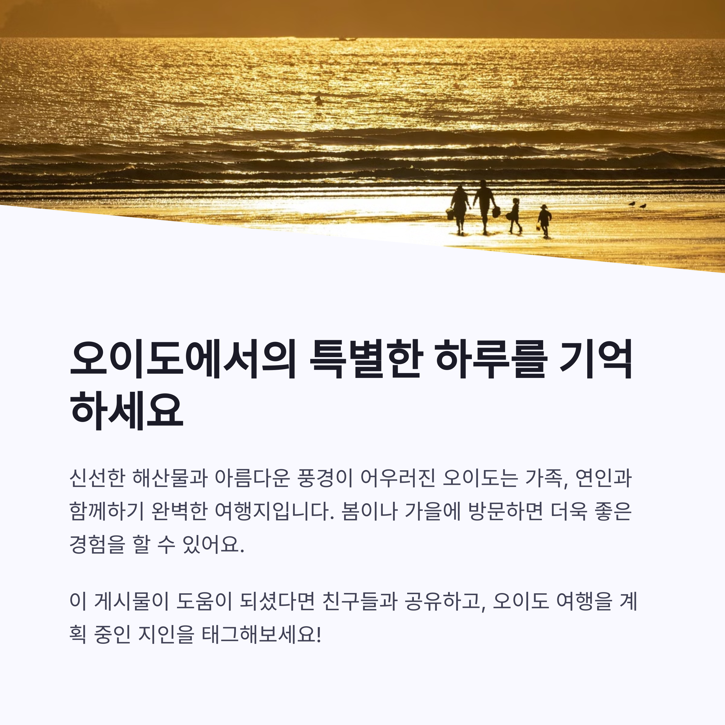 시흥 오이도 수산시장은 단순히 해산물을 구매하는 장소를 넘어서, 여행지로서의 매력을 갖춘 곳입니다. 신선한 수산물과 저렴한 가격, 그리고 낙조와 체험활동까지, 다양한 요소가 어우러진 공간입니다. 서울과 가까운 위치에 있어 부담 없이 당일치기 여행이 가능하며, 연인, 친구, 가족 모두에게 만족스러운 추억을 남겨주는 여행지로 추천드립니다. 다음 나들이 계획이 있다면 꼭 한 번 들러보세요.