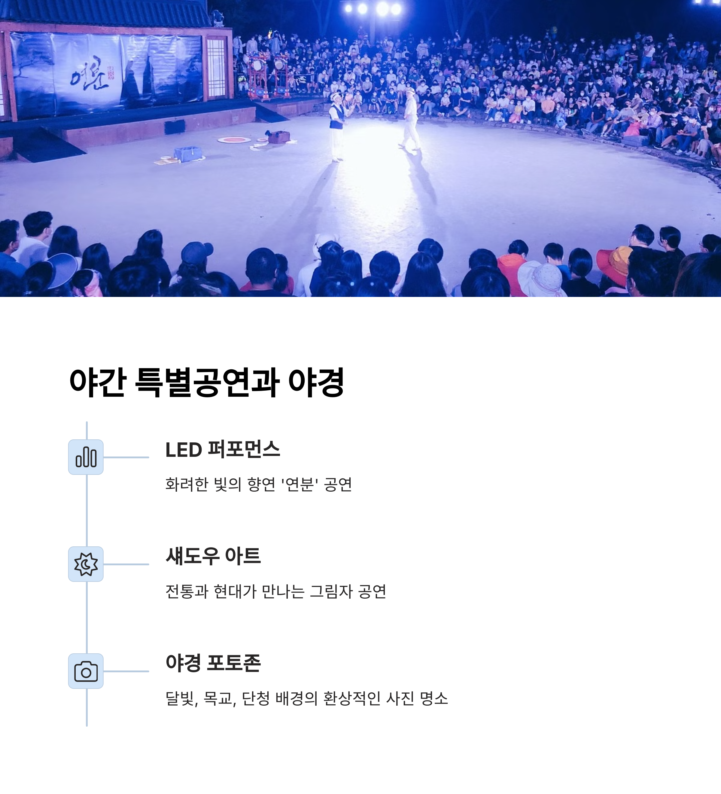 금·토·일 및 공휴일에는 전통 퍼포먼스와 야간 콘텐츠가 진행되며, 불빛 아래 전통 마을의 분위기를 즐길 수 있습니다.