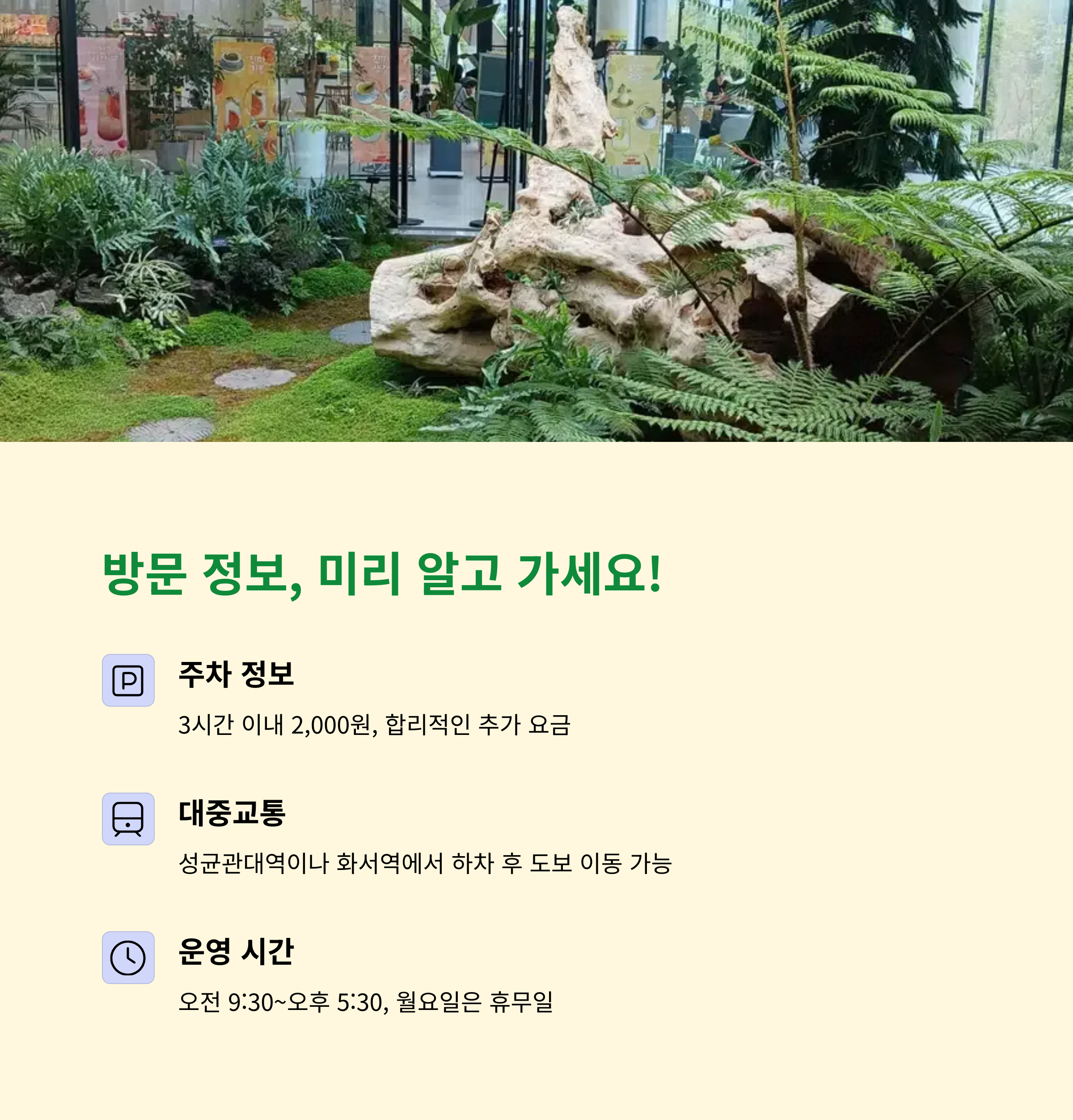 | 포토존과 내부 카페로 구성된 쉼 공간 | 가족·연인 모두에게 인기 많은 나들이 장소 | 3시간 2,000원의 합리적인 주차 요금 |