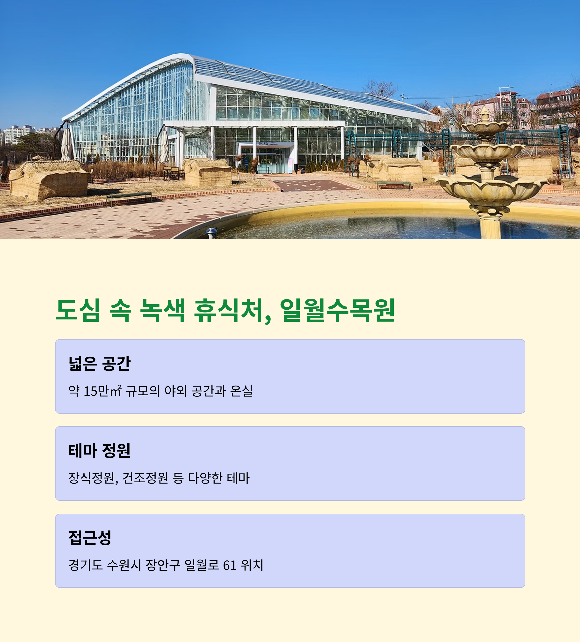 | 주요 추천 이유 | 테마 정원, 온실, 저수지 산책로, 카페까지 모두 갖춘 힐링 명소 |