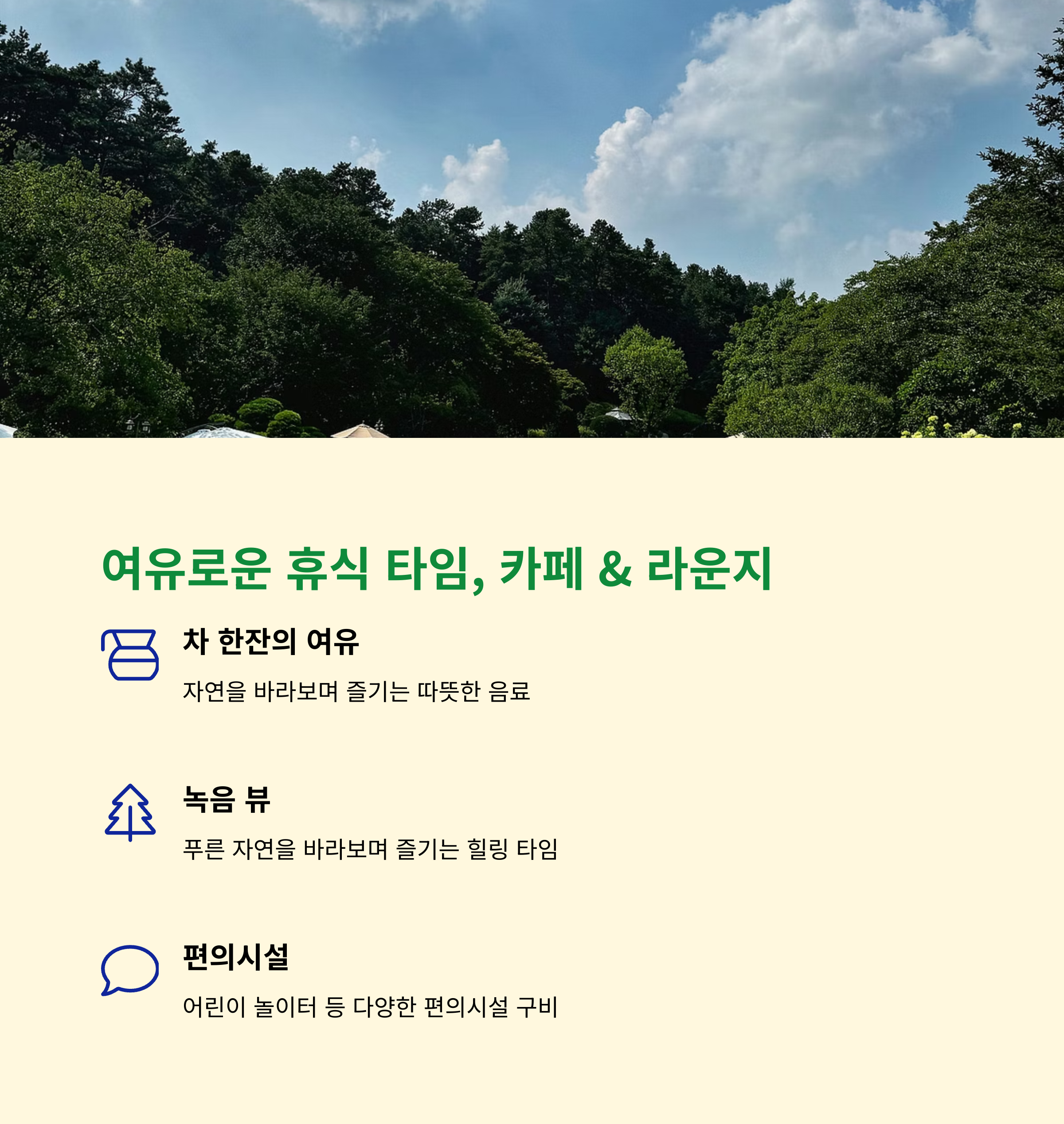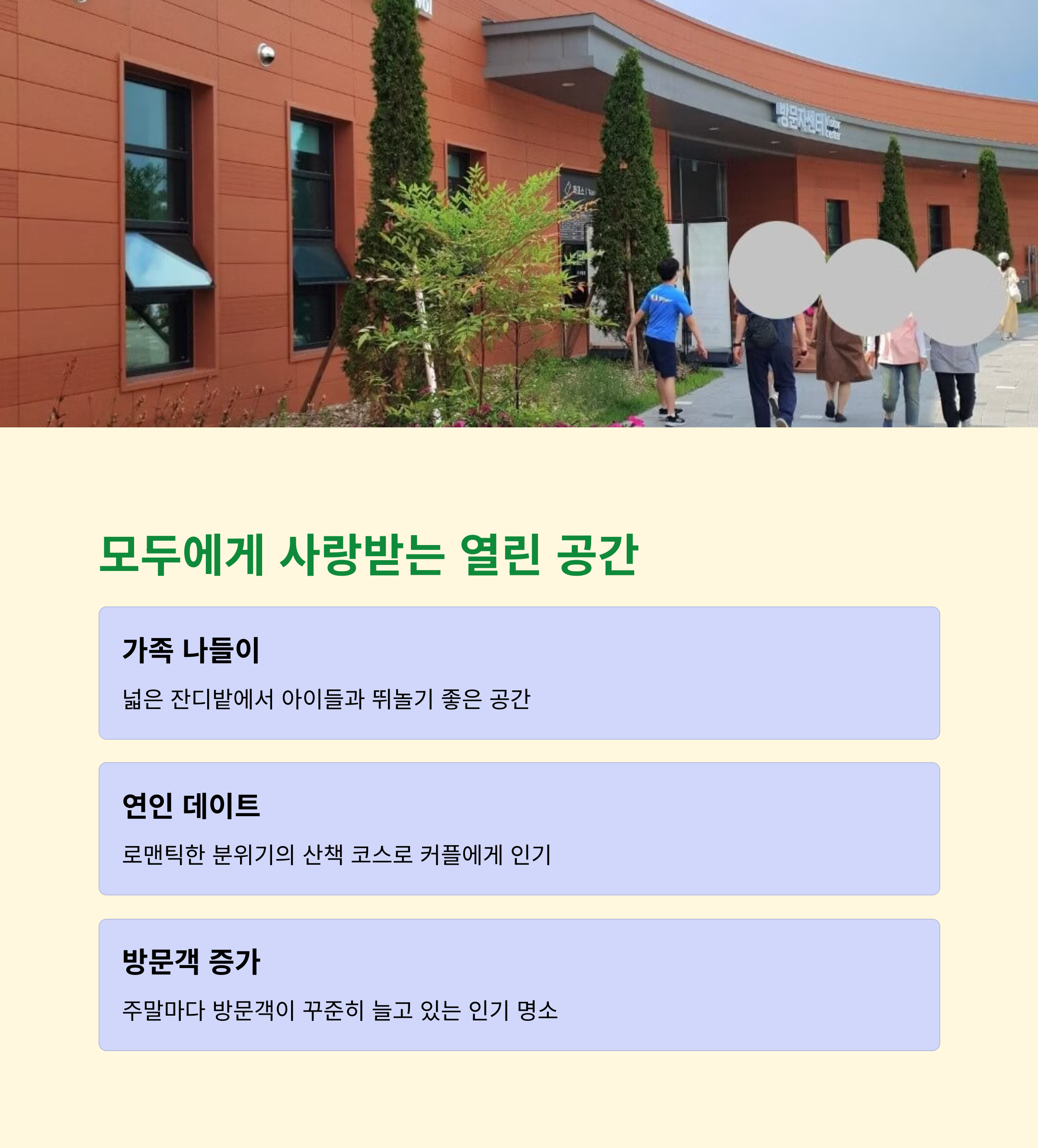 | 포토존과 내부 카페로 구성된 쉼 공간 | 가족·연인 모두에게 인기 많은 나들이 장소 | 3시간 2,000원의 합리적인 주차 요금 |