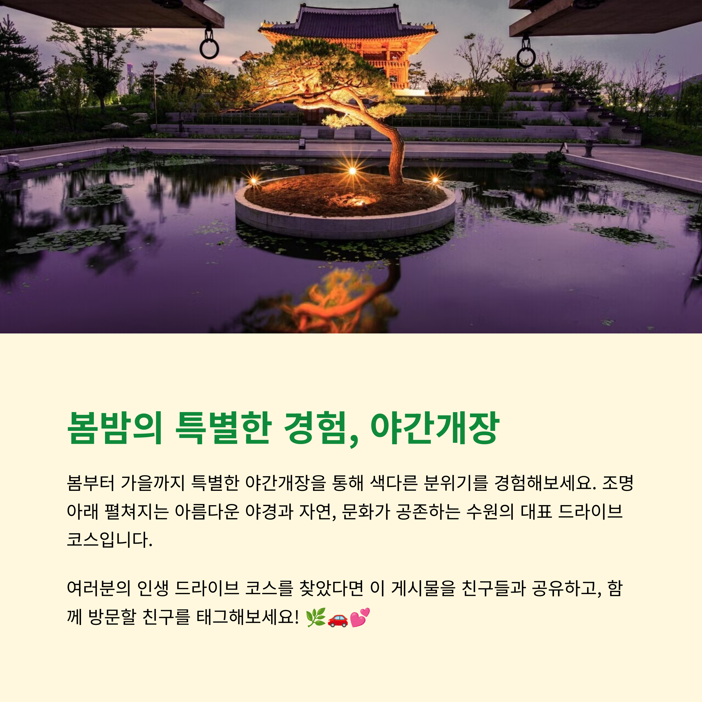 | 이용 팁 | 주차 3시간 2,000원 / 봄밤 야간개장 운영 / 산책 전 커피 한 잔 추천 |