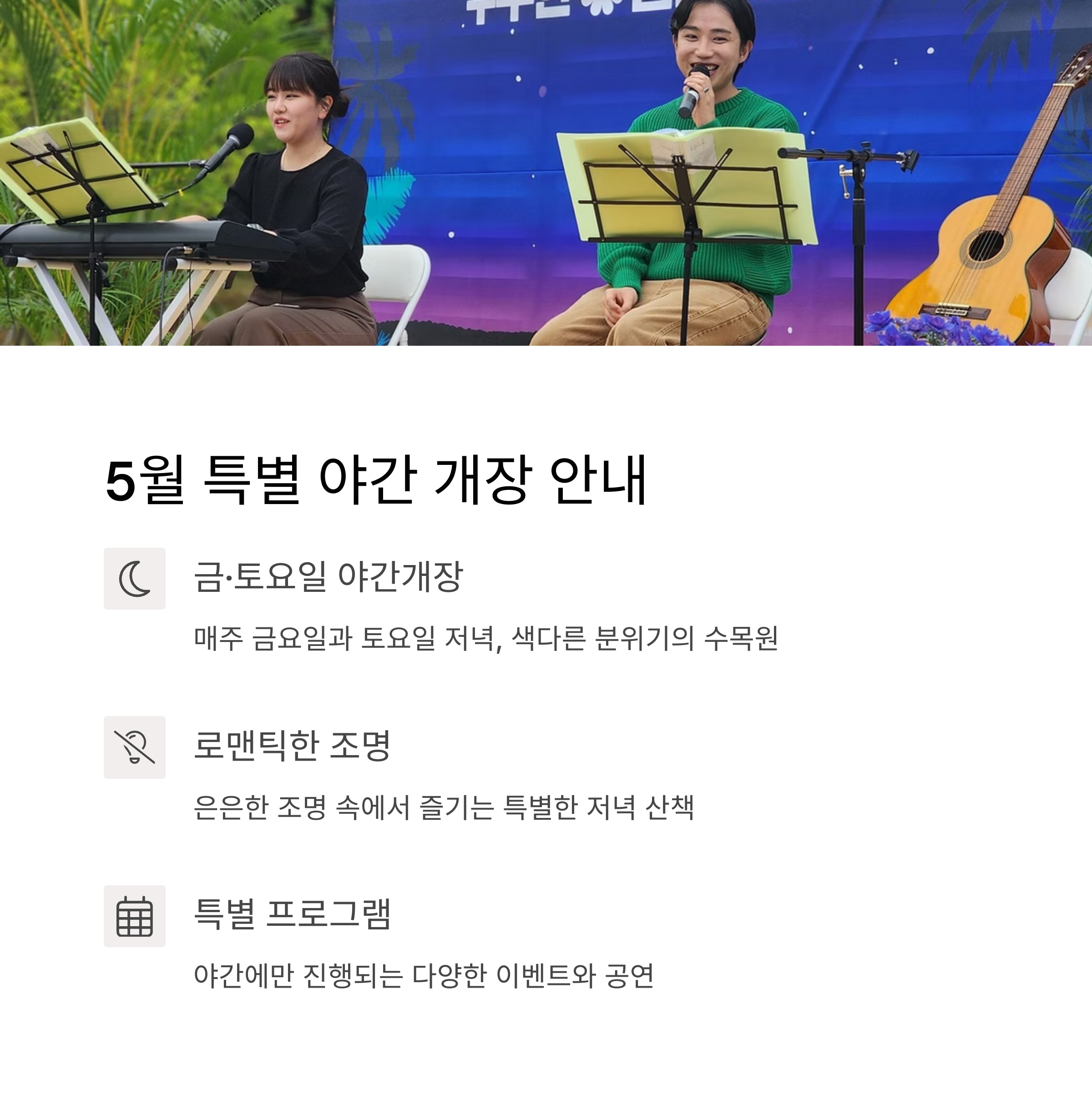 | 계절마다 변하는 아름다운 꽃과 숲길 | 가족·연인·친구와 함께 즐기는 힐링 공간 | 스탬프 투어와 야간개장 이벤트 운영 |