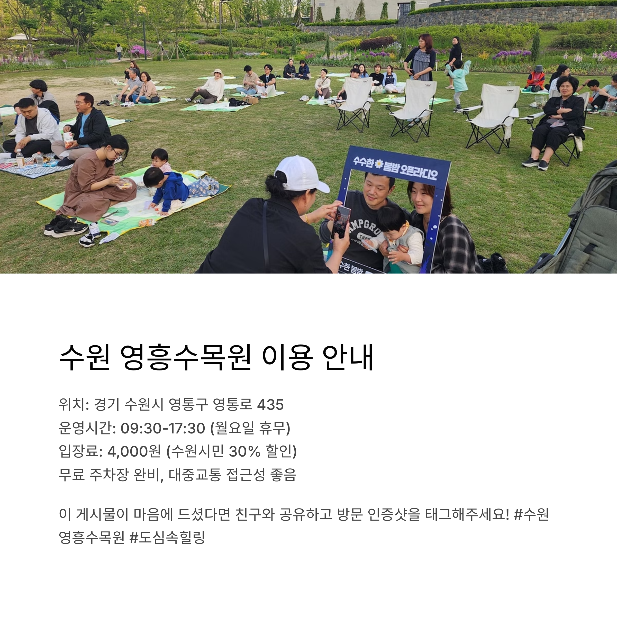 수원 영흥수목원에 다녀온 경험이 있으신가요? 기억에 남는 장소나 팁이 있다면 댓글로 공유해 주세요. 다른 분들의 나들이 계획에 도움이 될 수 있습니다!