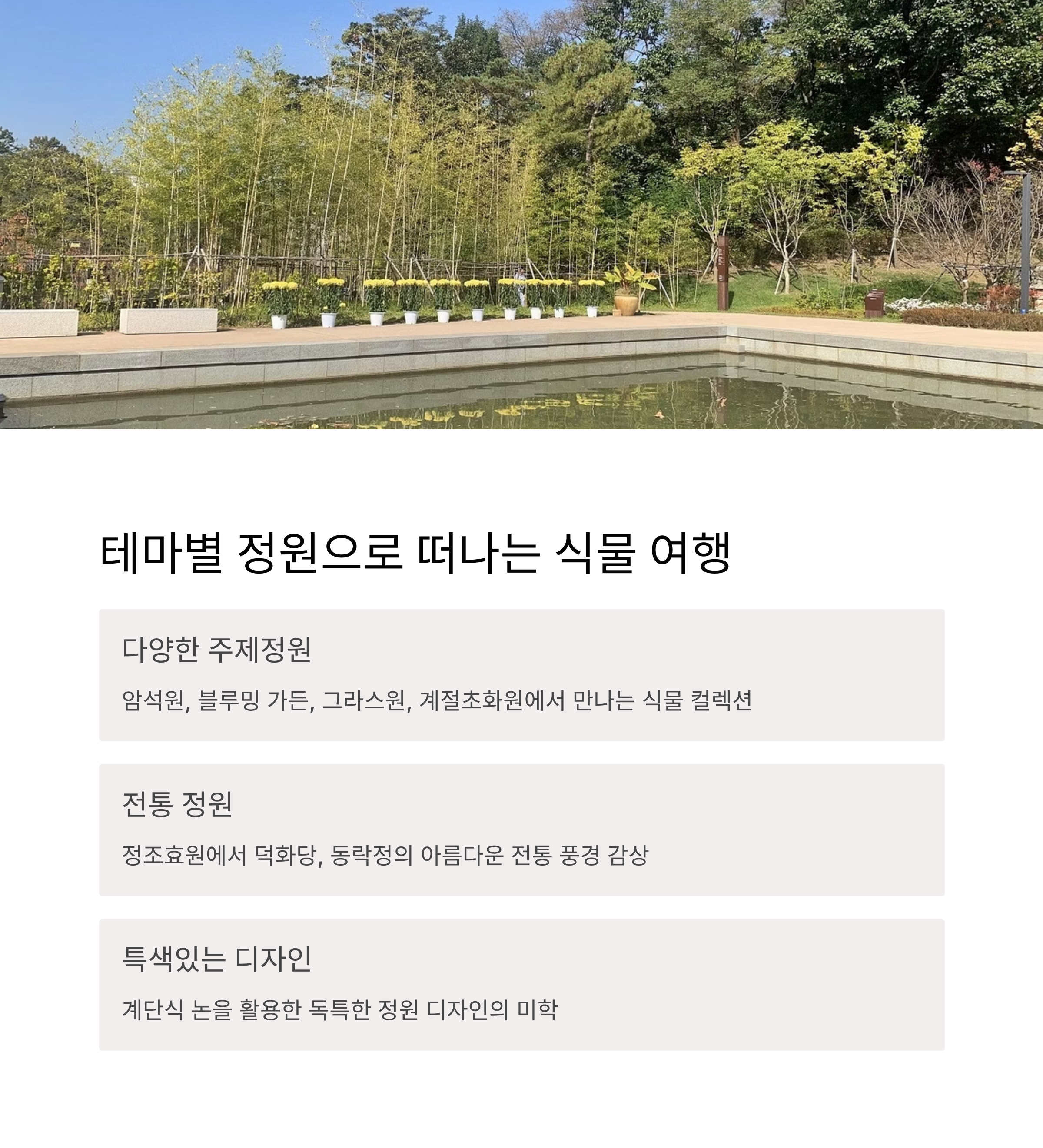 | 도심 속에서 즐기는 푸른 자연 힐링 | 온실·생태숲·정원 등 테마별 산책 코스 | 접근성 좋은 주말 나들이 명소 |