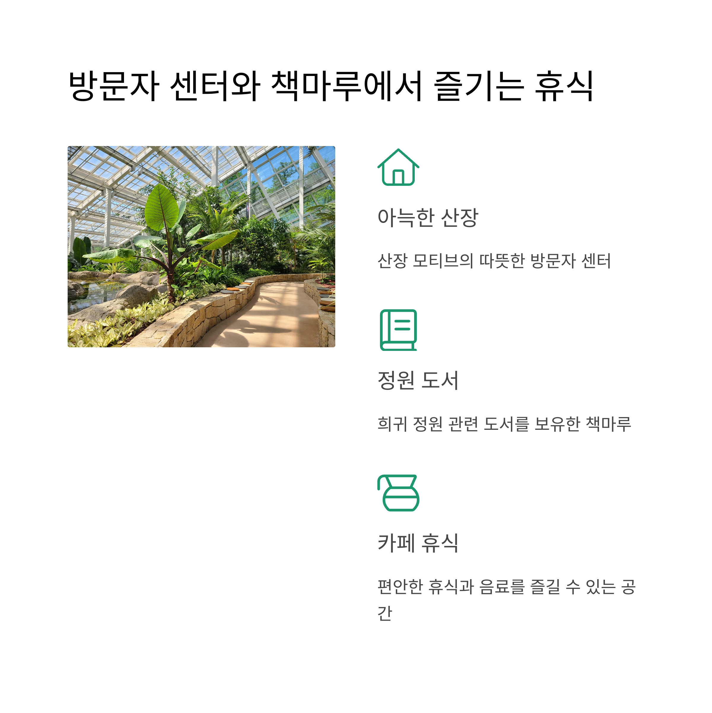 사계절 테마정원 온실, 생태숲, 잔디광장, 계절별 꽃길 등 테마 산책 코스