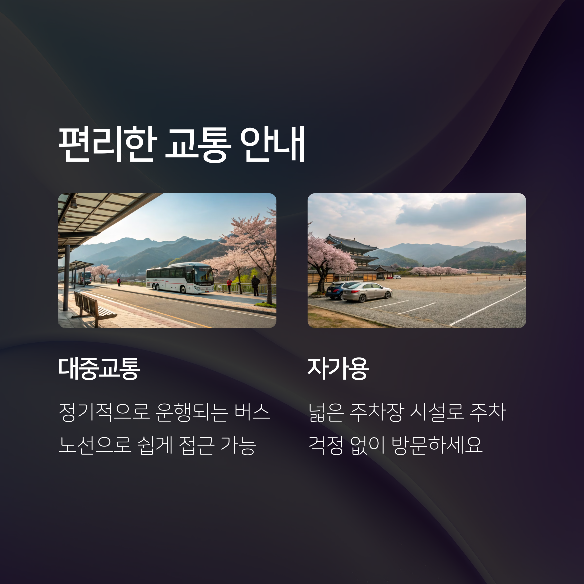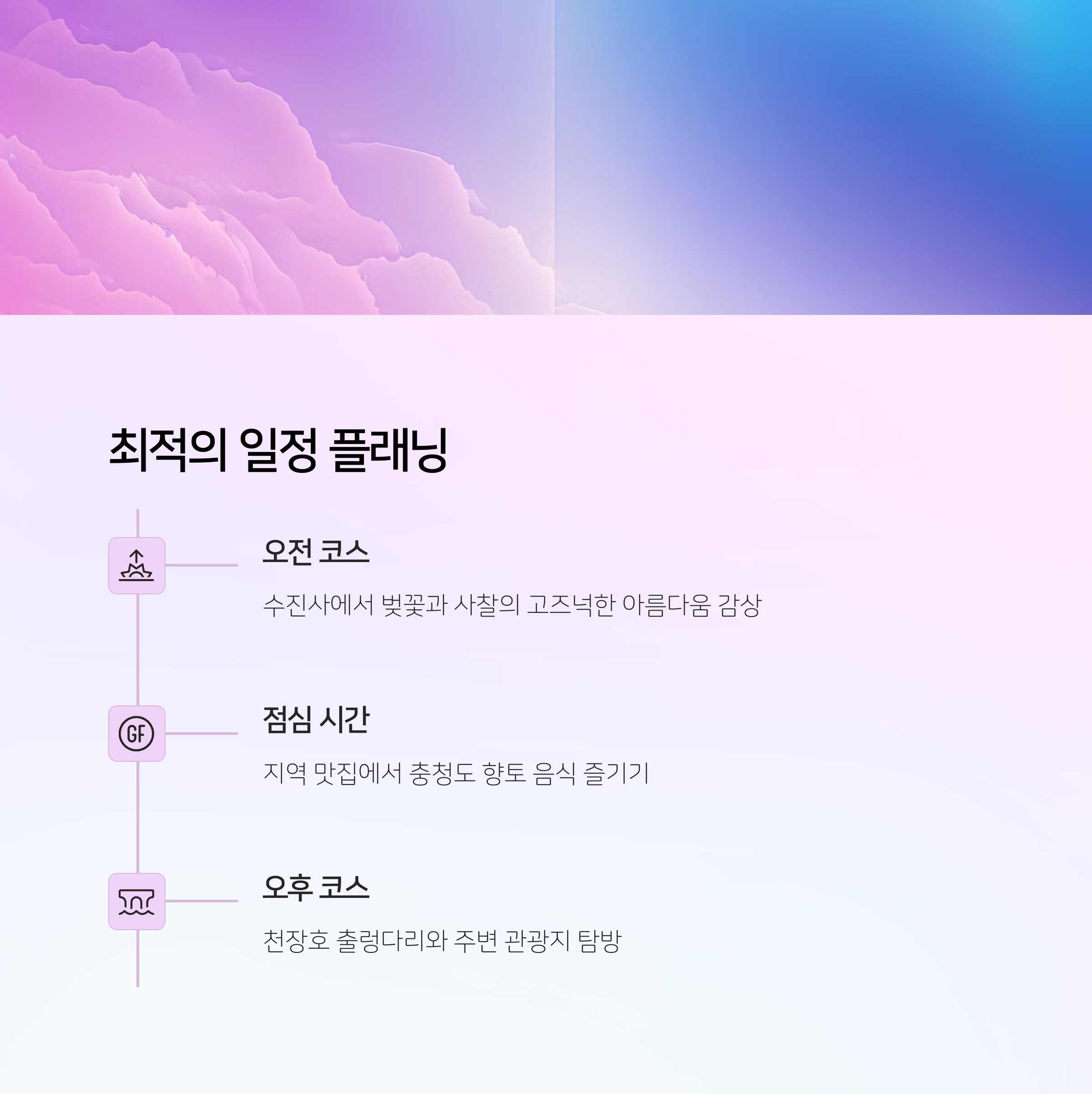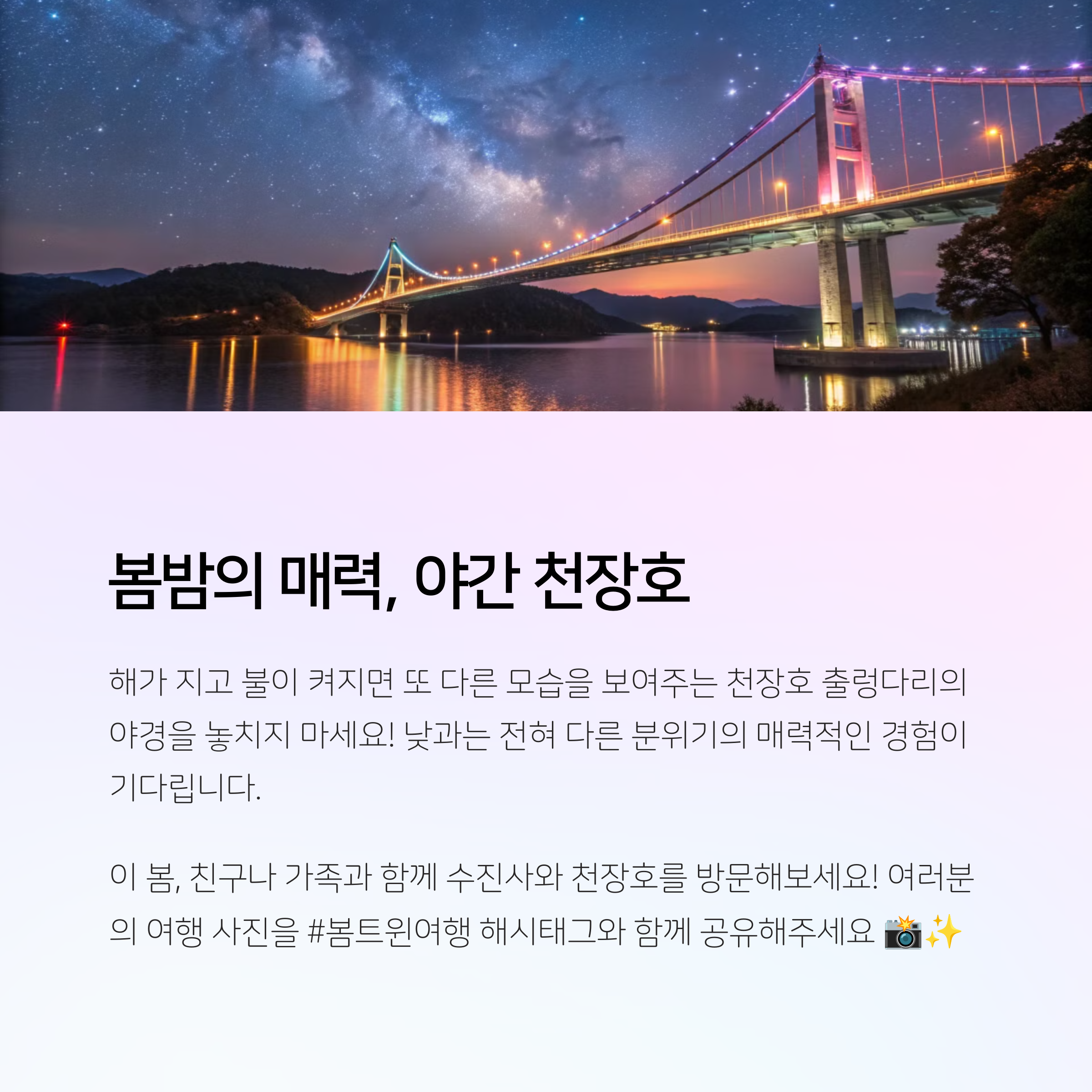 여행 팁으로는 오전 일찍 수진사에 방문하여 조용히 벚꽃을 감상한 후, 근처 맛집에서 점심 식사를 한 뒤 천장호 출렁다리로 향하는 것이 추천됩니다. 야간 개장 시기에 맞춰 방문한다면 다리 위에서 조명과 호수의 반영이 어우러진 환상적인 야경도 즐길 수 있습니다. 가족, 커플, 친구 단위로 모두 추천할 수 있는 봄철 최고의 트윈 여행 코스입니다.