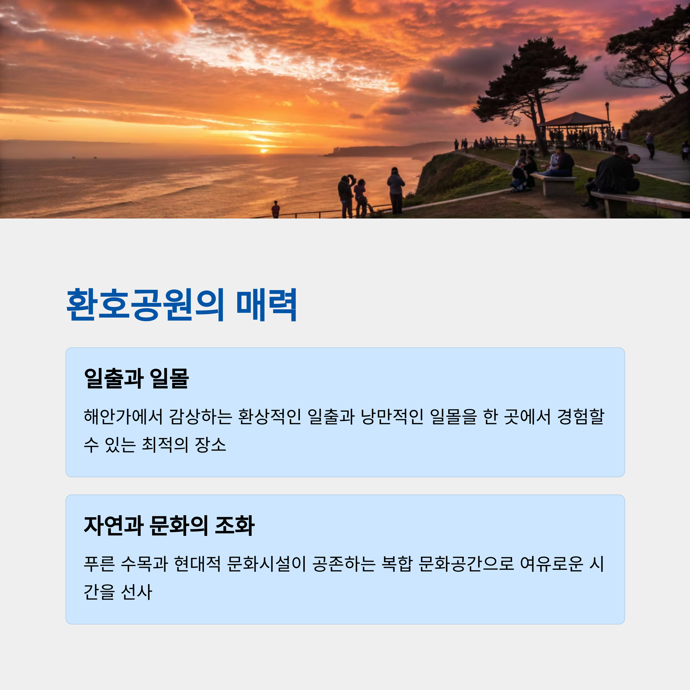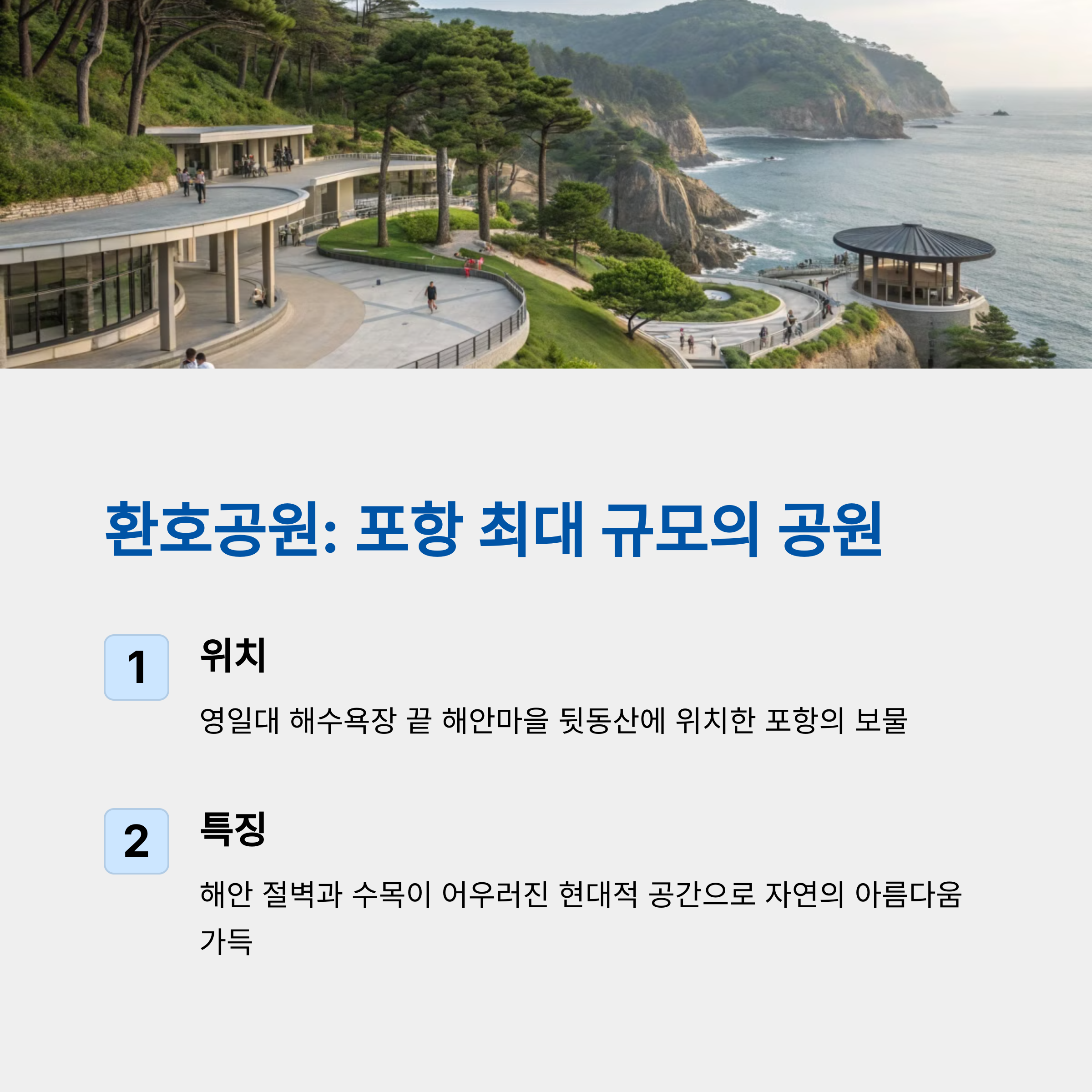 | 환호공원 | 포항 최대 규모 공원, 해안 절경 | 일출·일몰 명소, 다양한 시설 |
