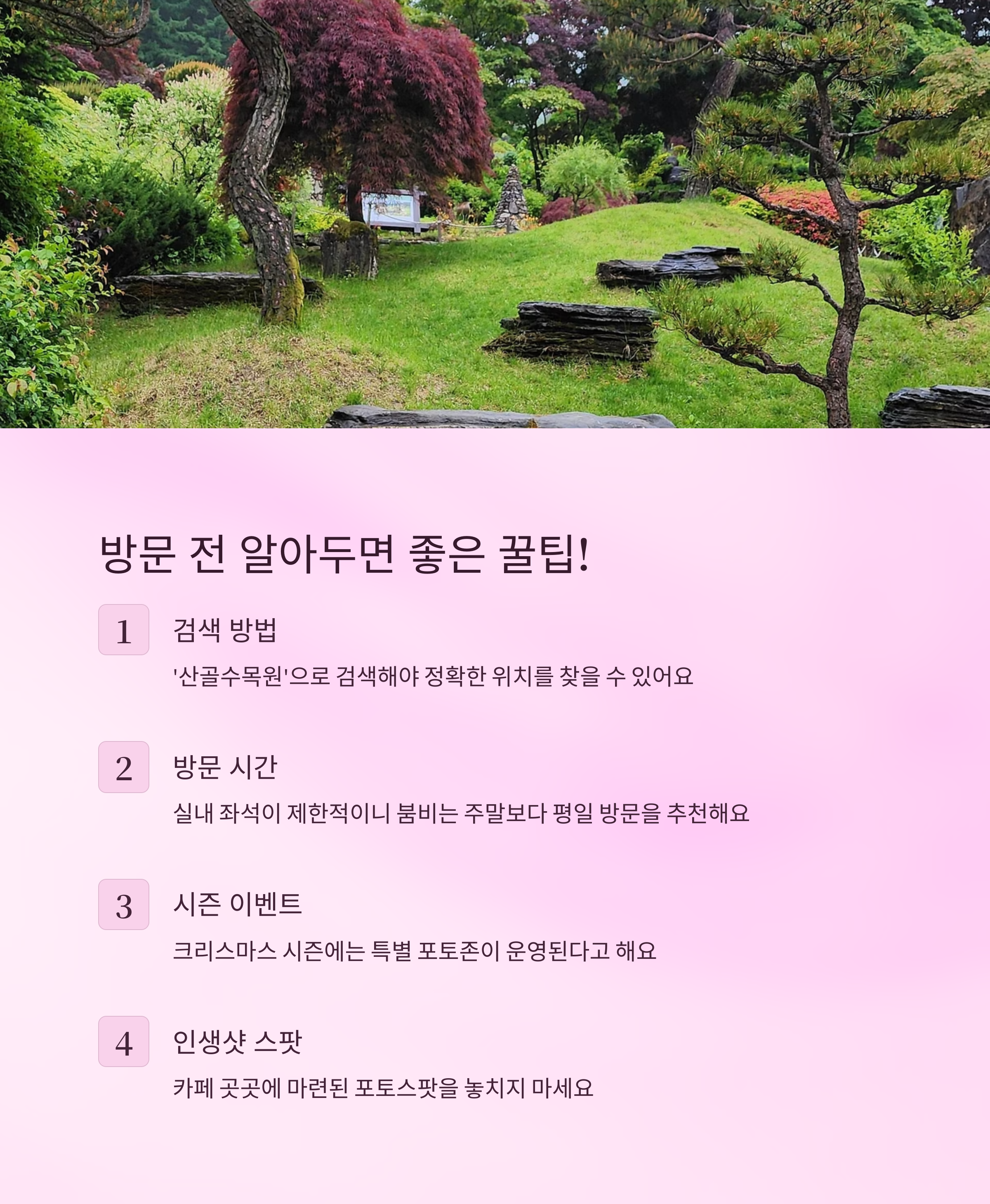 시흥 ‘산골수목원’에 다녀오신 경험이 있으신가요? 추천하고 싶은 포인트나 계절별 방문 팁이 있다면 댓글로 자유롭게 남겨주세요. 자연을 좋아하는 다른 분들께 큰 도움이 됩니다!