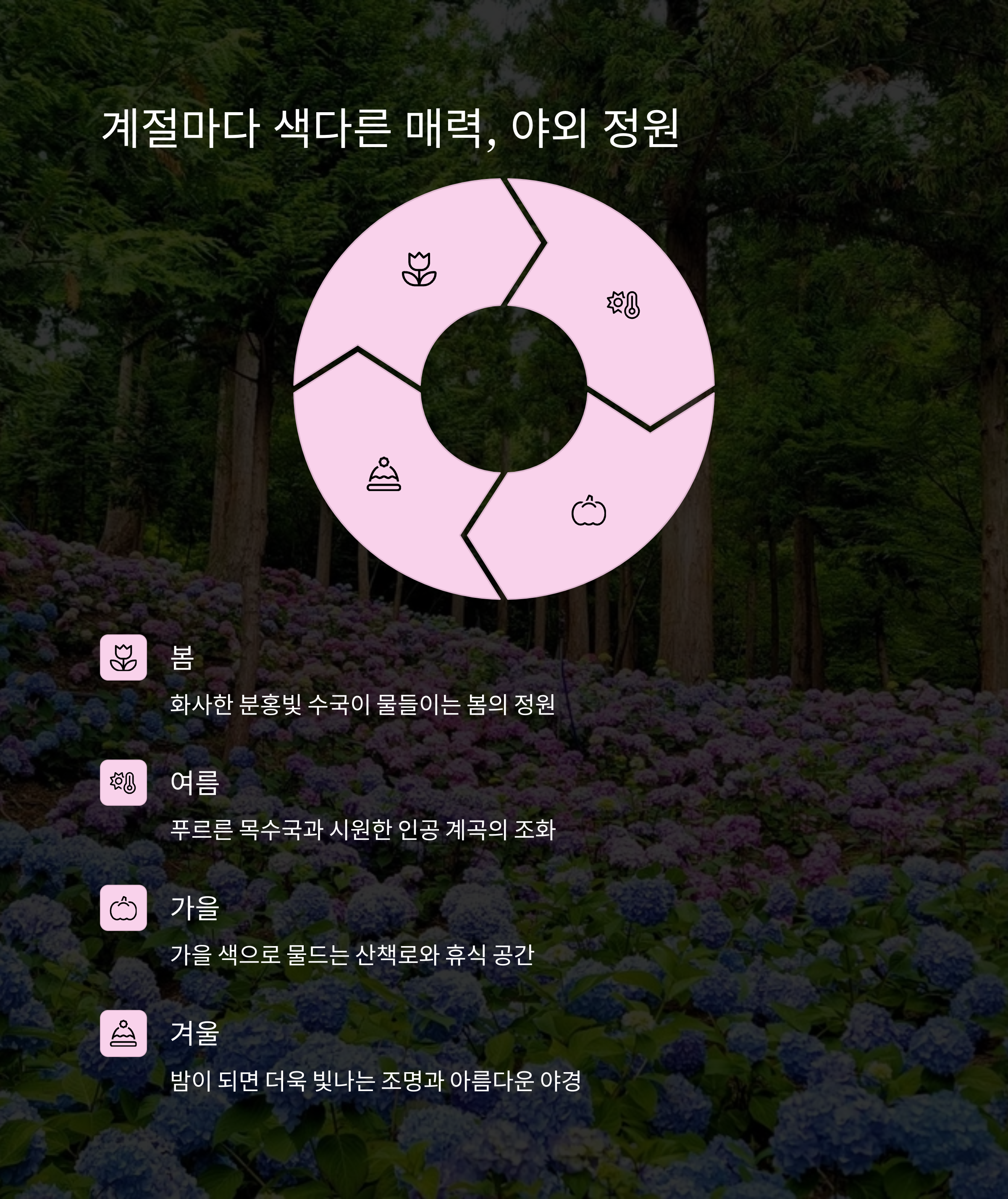 | 힐링 포인트 | 인공폭포, 수로, 수국 등 계절별 식물과 조경 감상 |