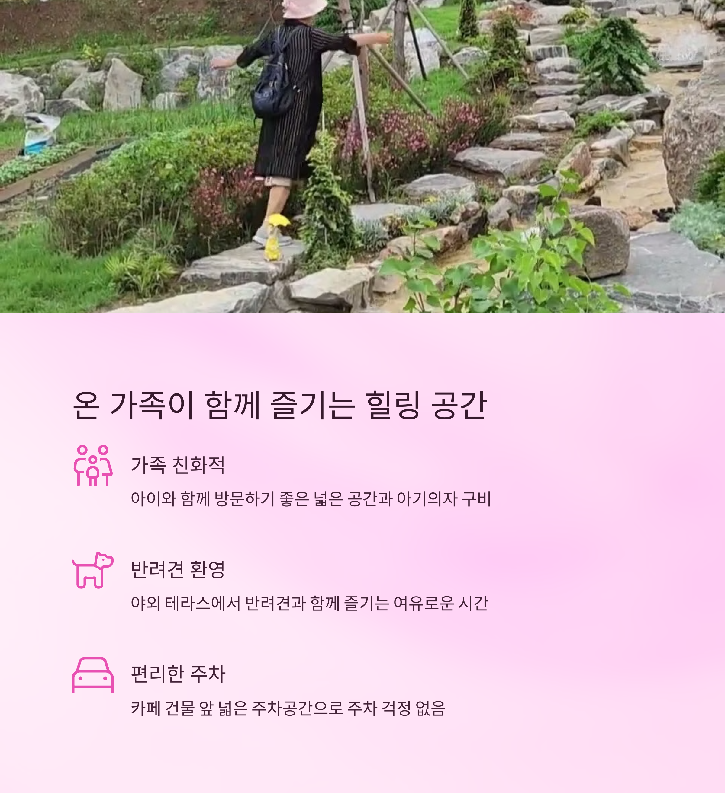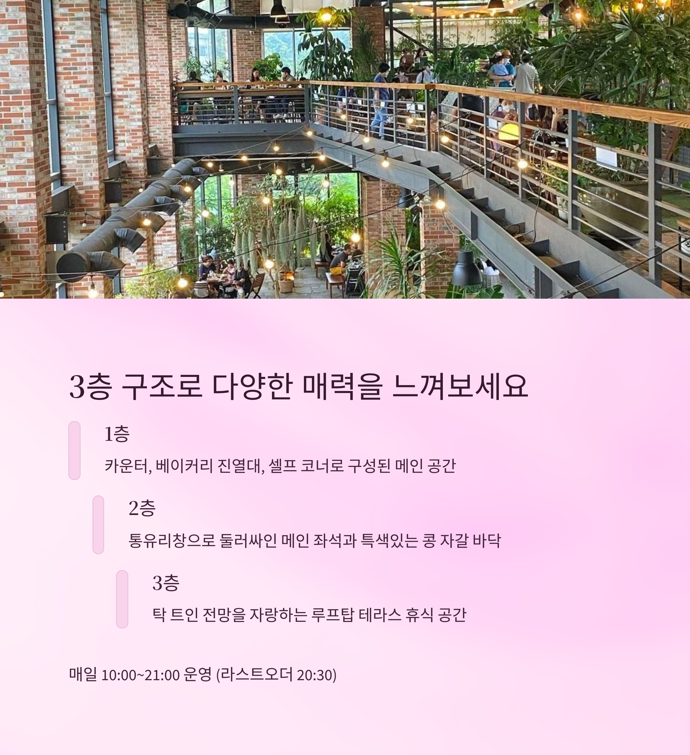 다양한 휴식 공간은 이곳의 가장 큰 매력입니다. 온실정원, 루프탑 테라스, 야외 산책로 등 각 공간마다 자연과 더욱 가까이 마주할 수 있어 오랜 시간 머물기에도 부담이 없습니다. 곳곳에 마련된 좌석과 포토존은 커플 데이트, 가족 나들이, 혼자만의 힐링 타임까지 어떤 형태의 방문에도 잘 어울리며, 아이와 반려견 동반도 가능해 더욱 다채로운 방문이 이루어지고 있습니다.