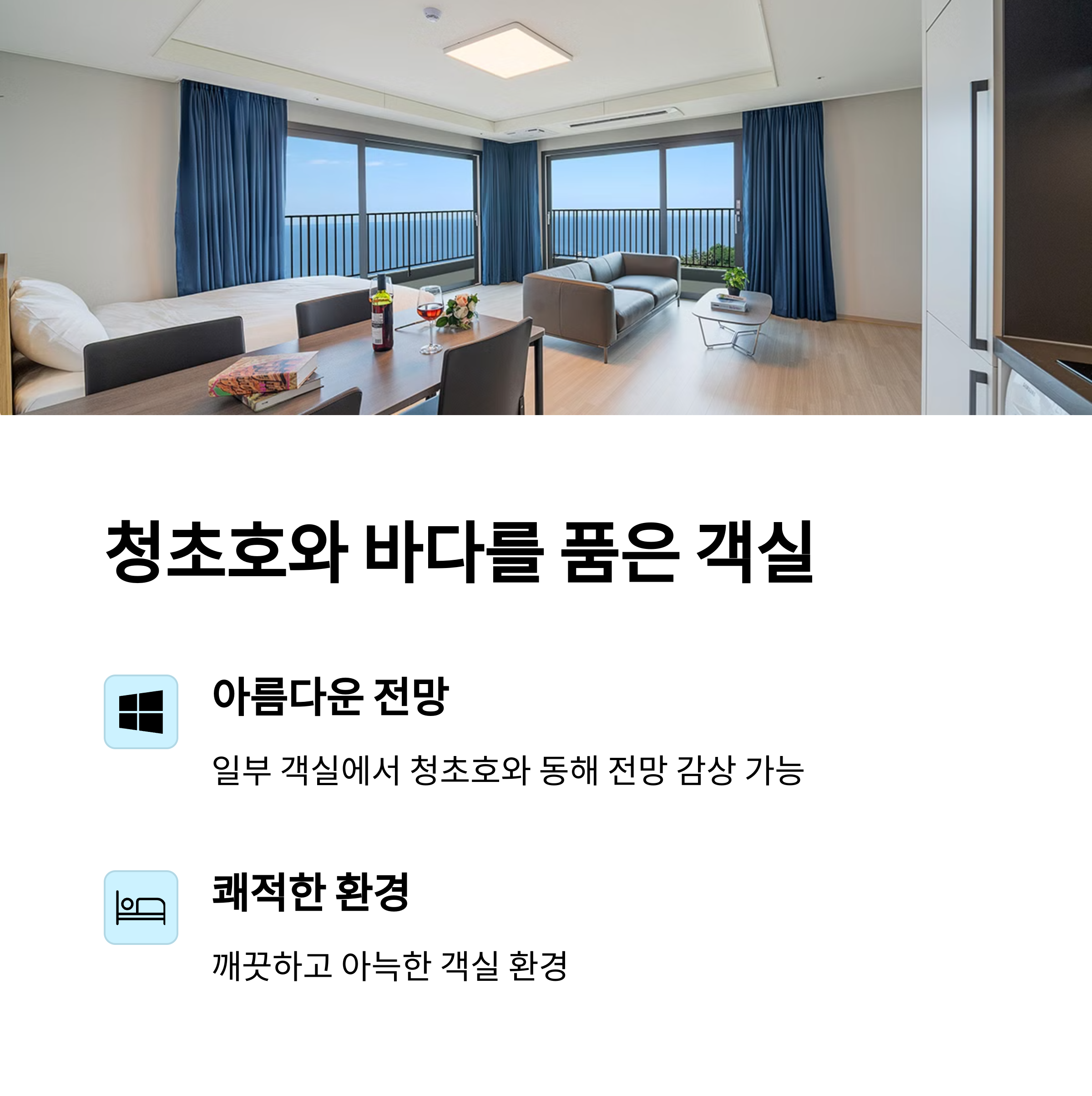| 바다 전망 숙소, 조식 만족도, 청초호 인접 | 해안 산책로, 파도소리, 힐링코스 | 가족여행, 걷기 좋은 코스, 근교 명소 |