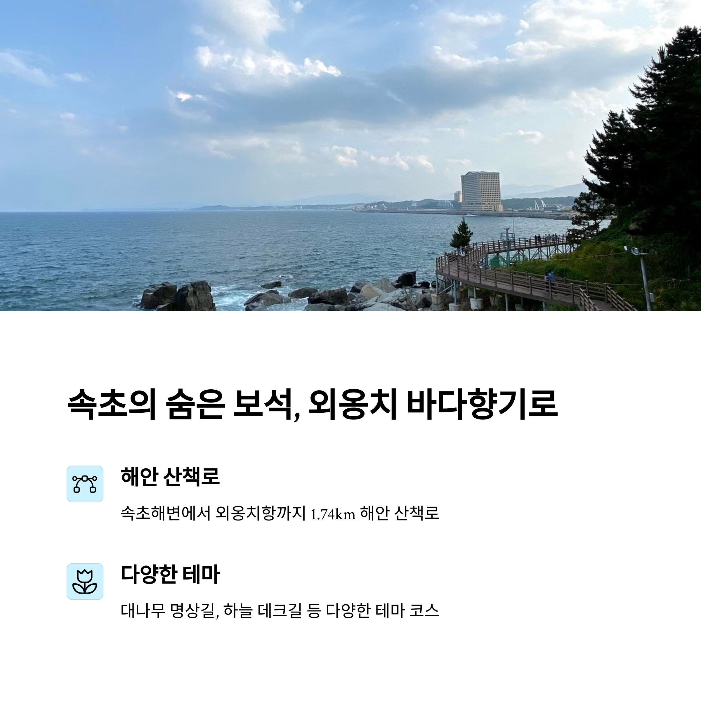 외옹치 바다향기로는 속초해변과 외옹치항을 연결하는 약 1.74km의 해안 산책 코스로, 걸음걸음마다 파도 소리와 동해의 풍경이 감성을 자극합니다. 코스는 완만하게 설계되어 있어 어린이나 어르신도 편안하게 이용할 수 있으며, 대나무 숲 명상길, 하늘 데크길 등 테마 공간이 다양해 걷는 즐거움을 더해줍니다. 특히 일출 시간대에 방문하면 햇살에 반사된 바다빛이 환상적인 풍경을 선사합니다.