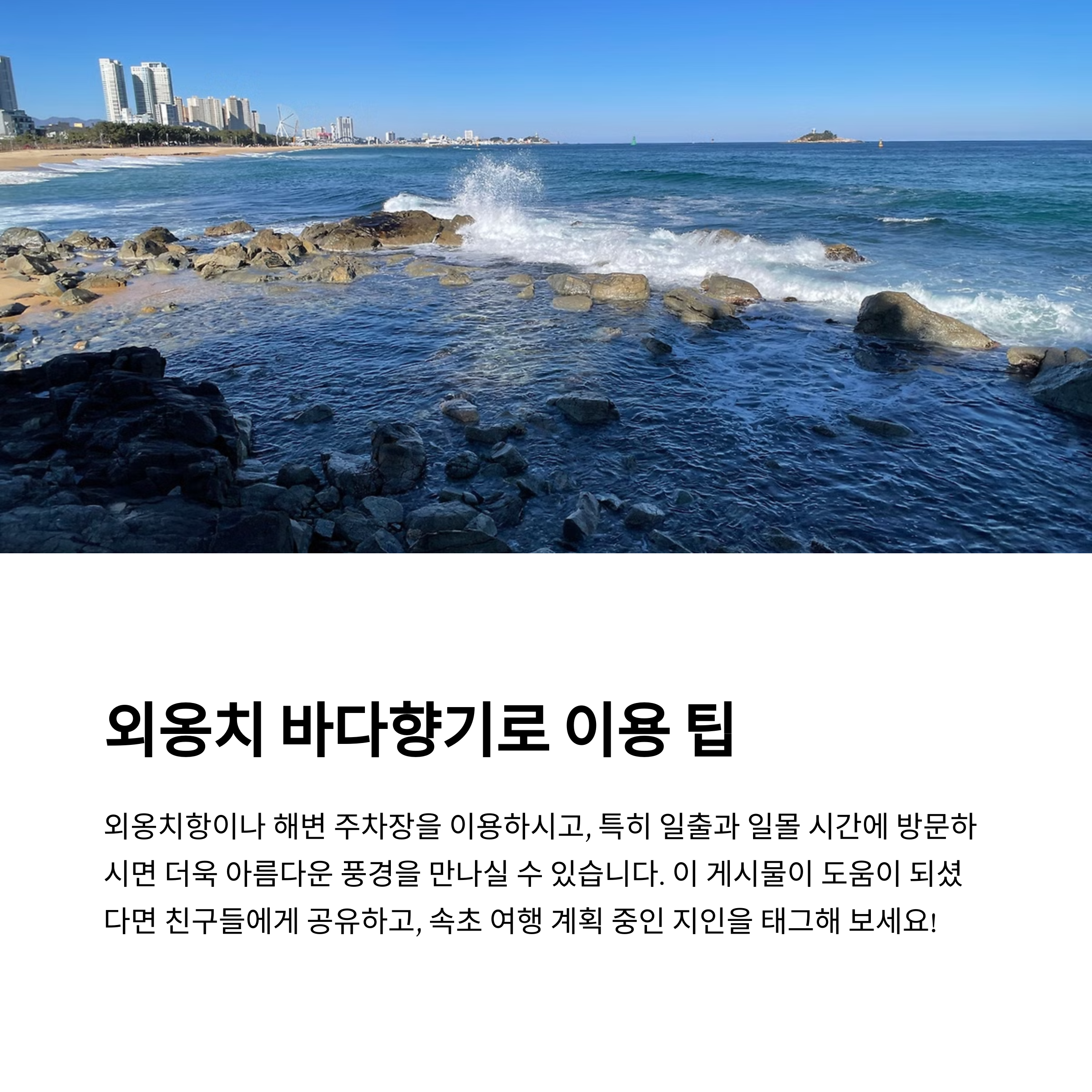 여행 동선에서 씨크루즈호텔과 외옹치 바다향기로는 조화를 이루는 훌륭한 조합입니다. 숙소에서 출발해 아침 조식을 든든히 먹은 뒤 외옹치 산책로를 따라 여유로운 산책을 즐겨보세요. 차량은 외옹치항 또는 속초해변에 주차할 수 있으며, 산책 후 근처 시장이나 카페에서 시간을 보내기에도 좋습니다. 짧은 일정 속에서도 자연과 숙소의 균형을 누리고 싶은 분들께 꼭 추천드립니다.