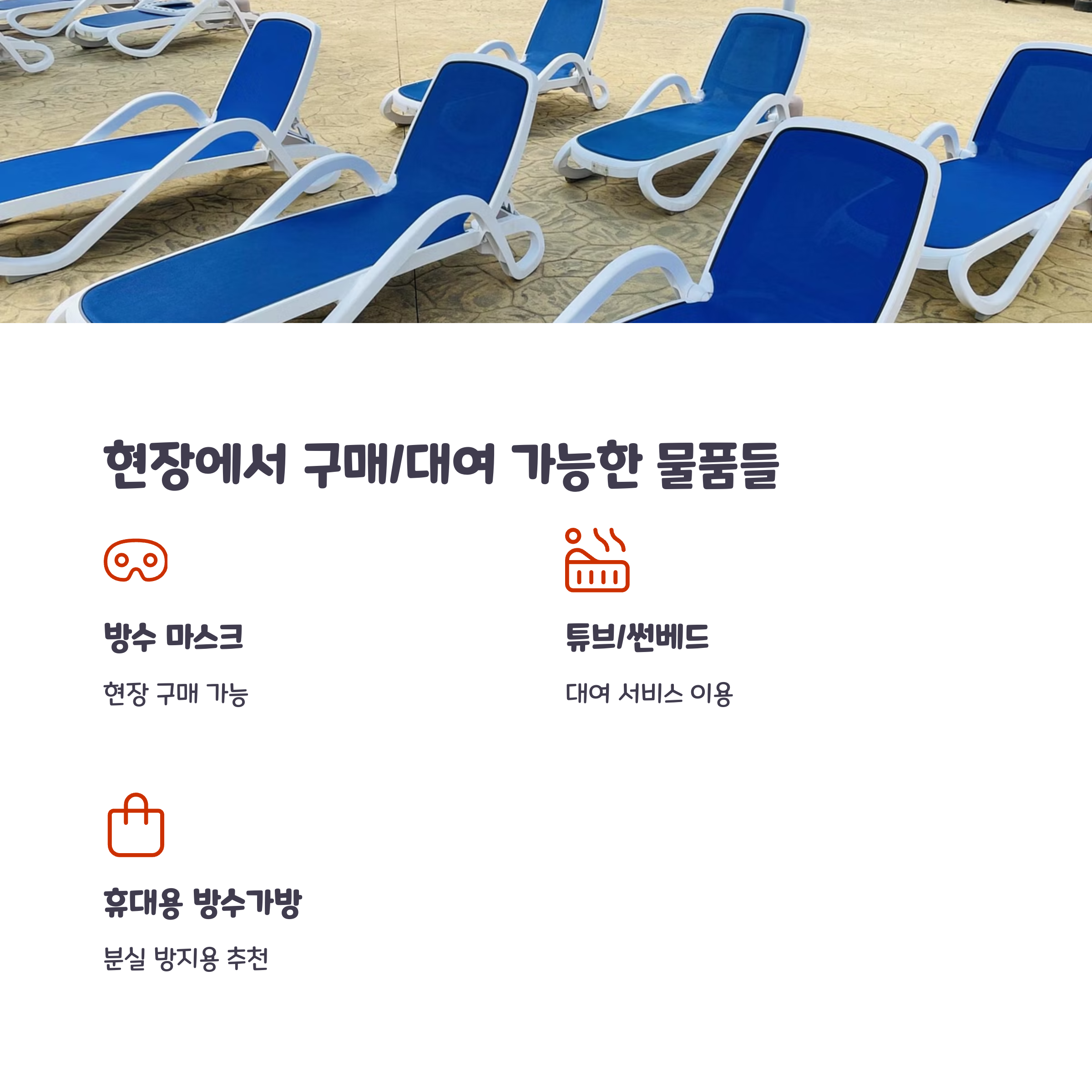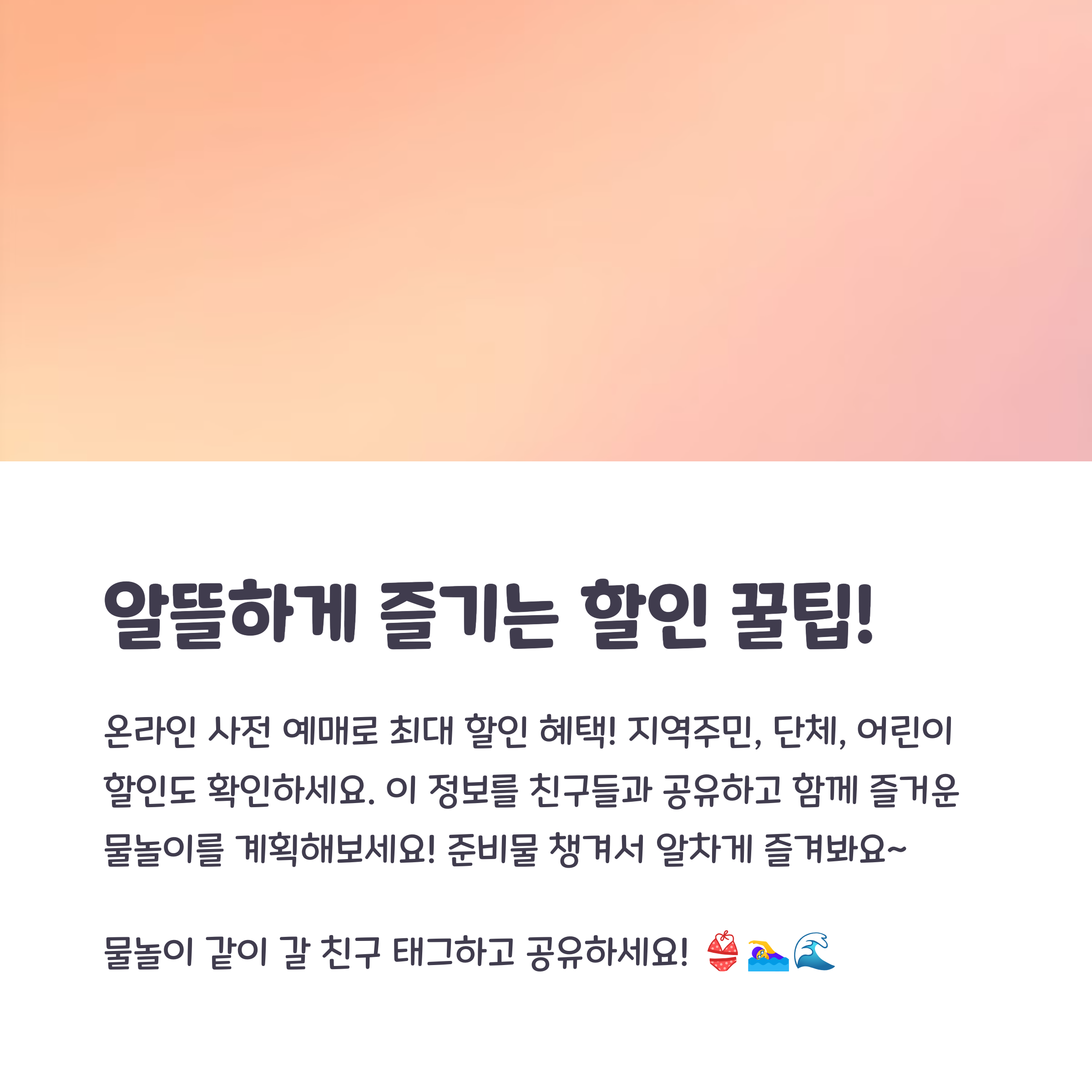 | 수영복, 방수팩, 구명조끼 챙기기 | 수건, 세면도구는 현장 비치 | 음식물 반입 불가, 할인정보 확인 필수 |