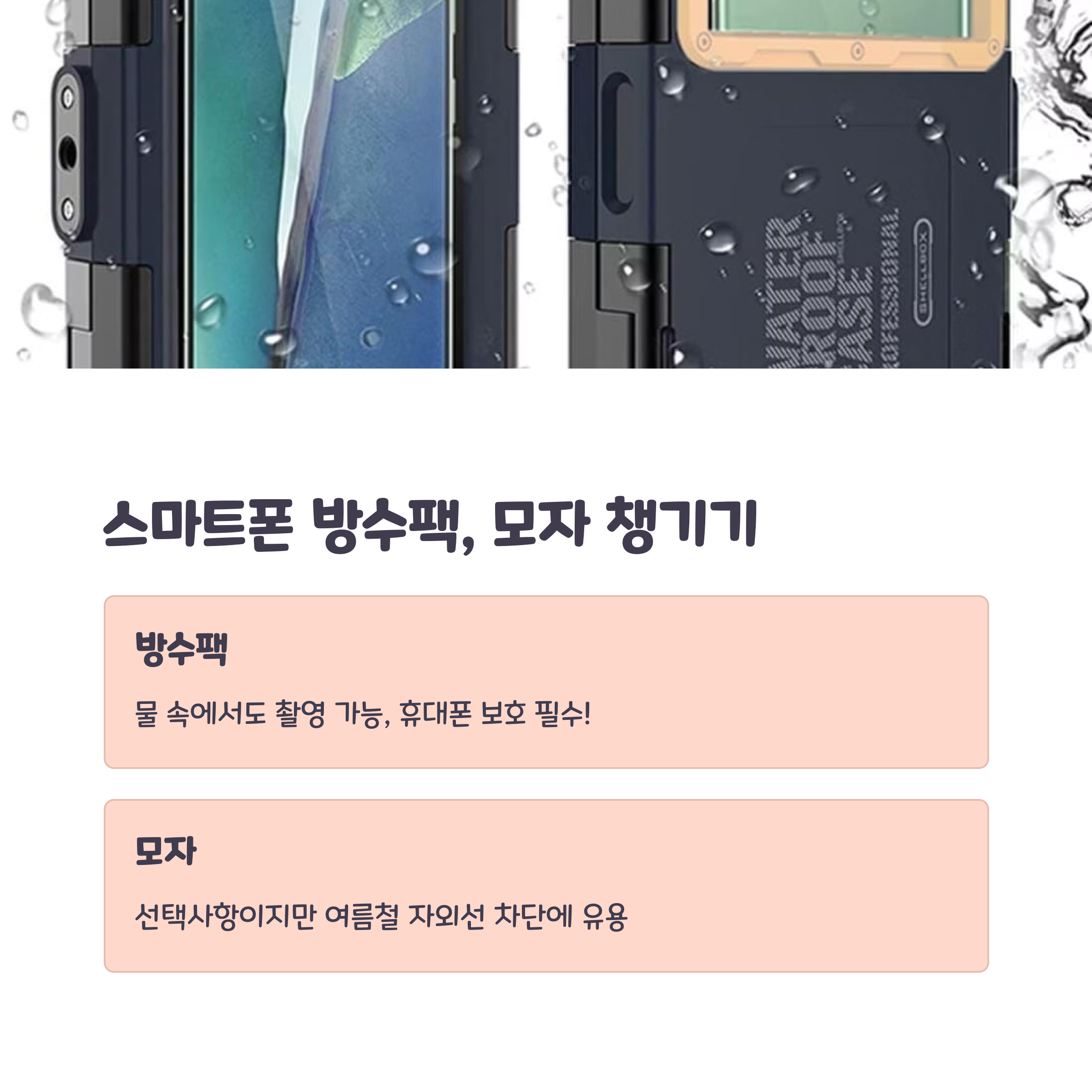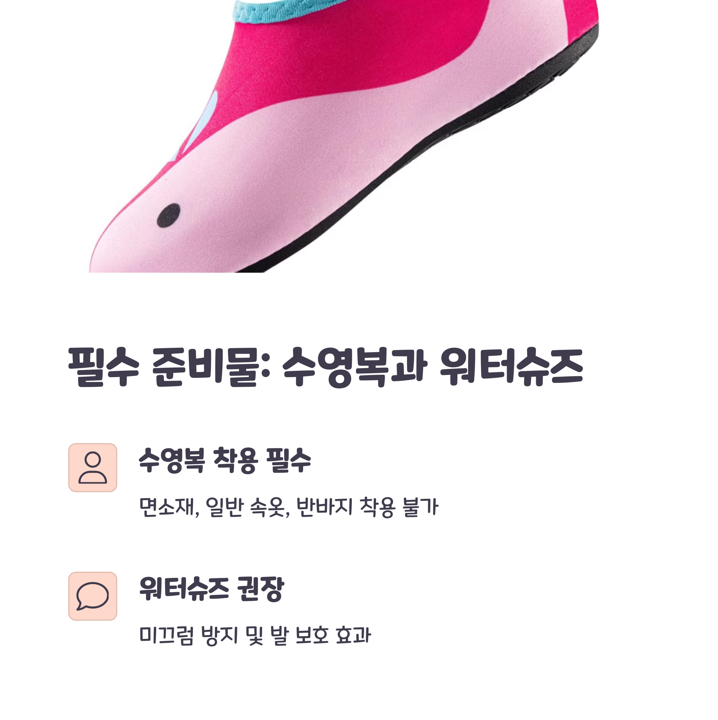 | 기본 준비물 | 수영복, 워터슈즈, 방수팩, 방수마스크, 모자(선택) |