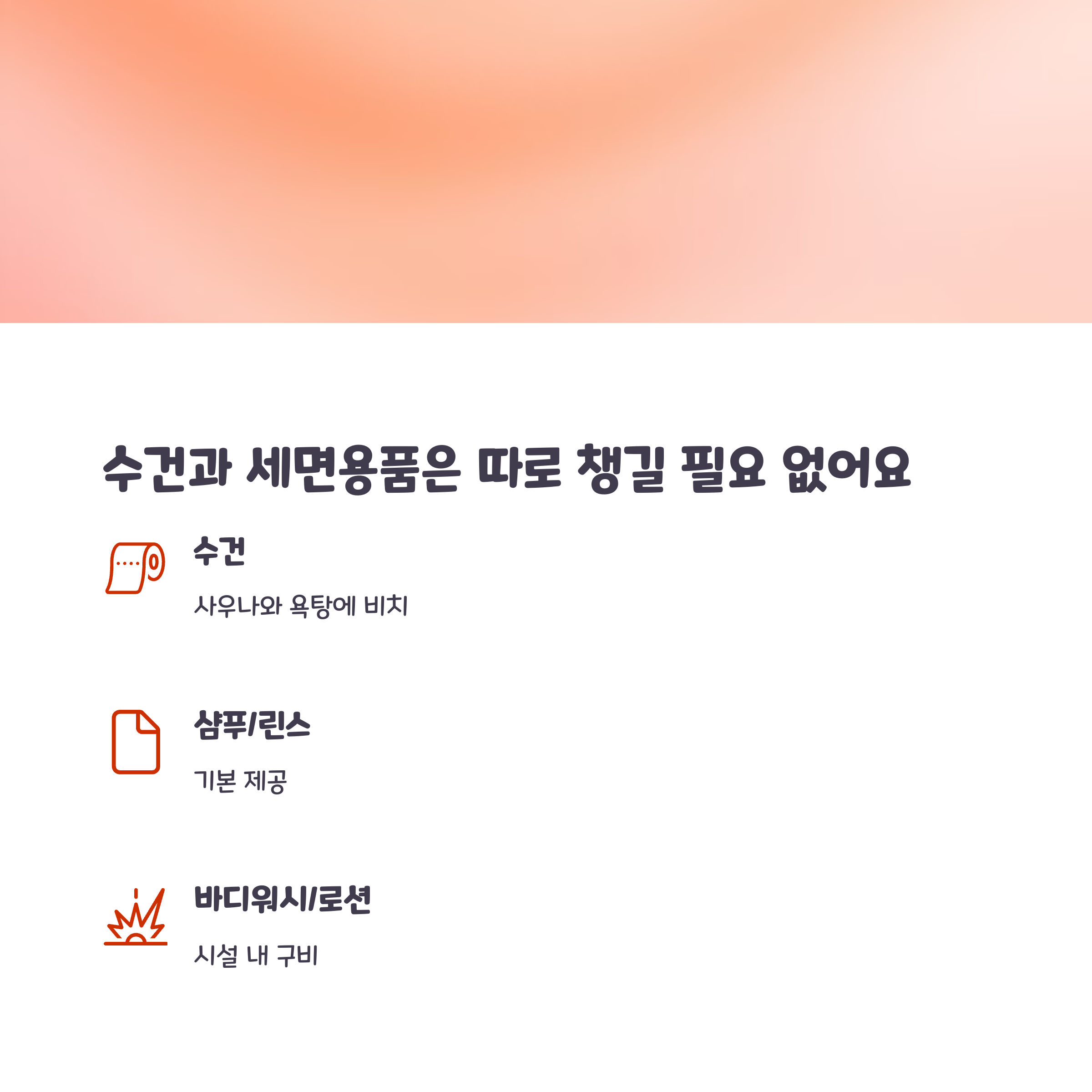 | 현장 제공품 | 수건, 샴푸, 린스, 바디워시, 로션 등 사우나 내 비치 |