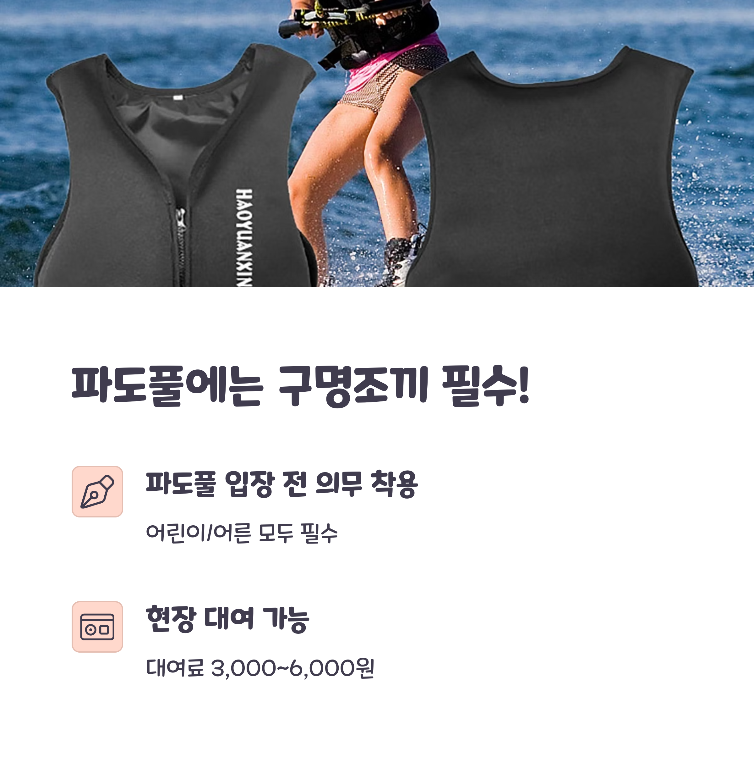 | 파도풀은 구명조끼 필수 | 방수마스크 현장 구매 가능 | 가족 단위 여행객에게 인기 |