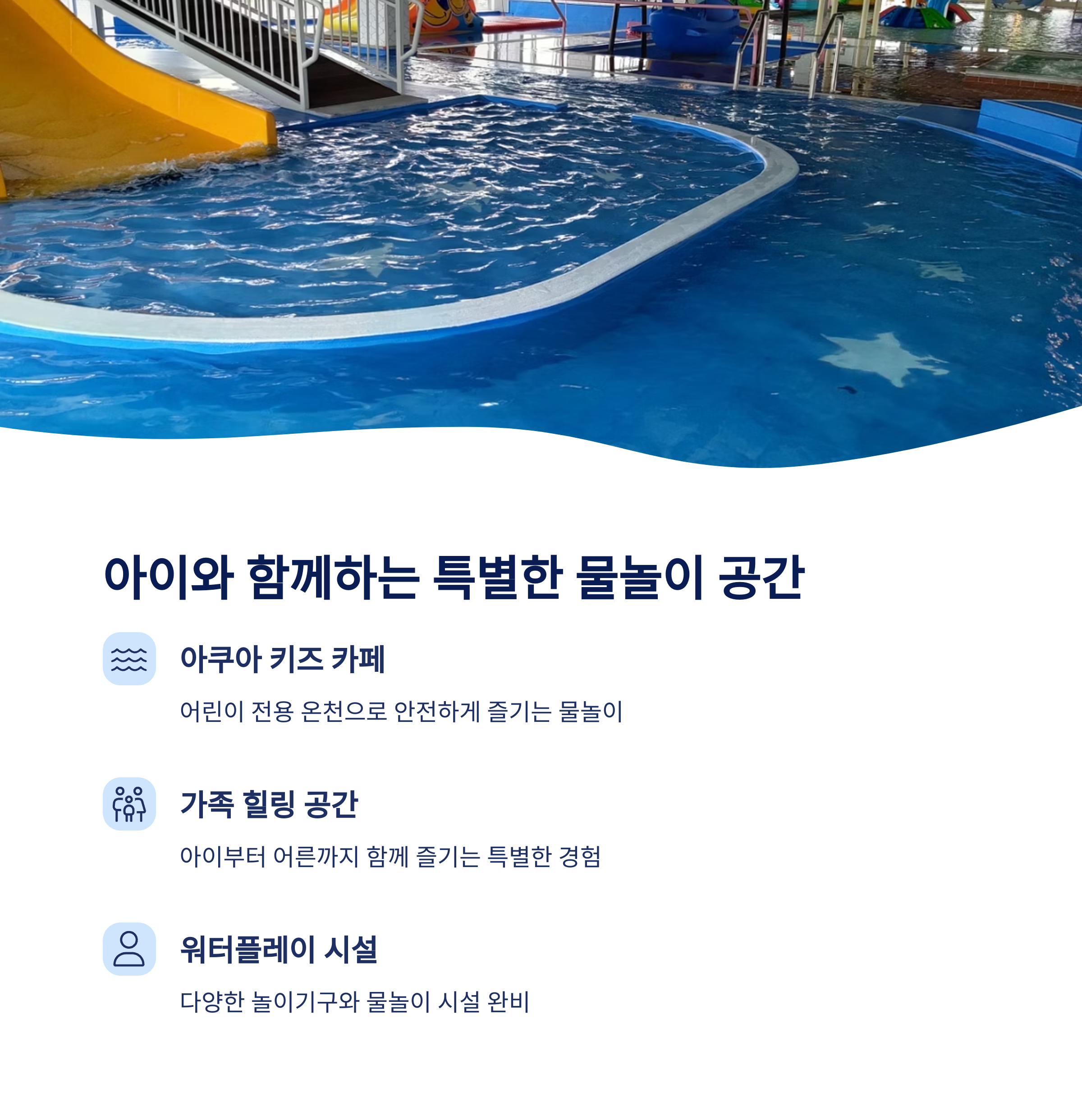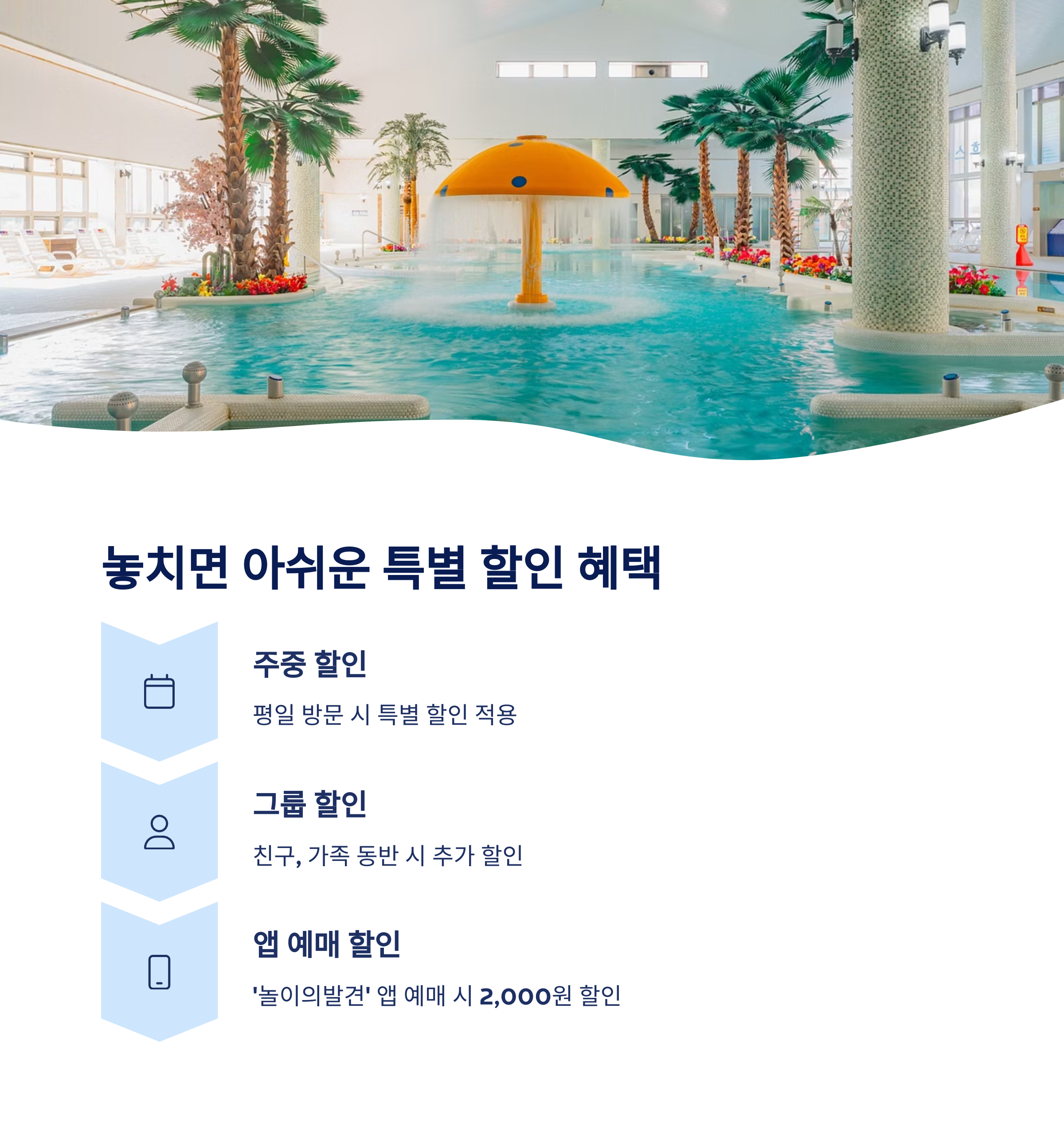 | 100% 천연 알칼리 온천수 사용 | 가족 모두를 위한 힐링 공간 | 놀이의발견 앱 통한 할인 예약 |