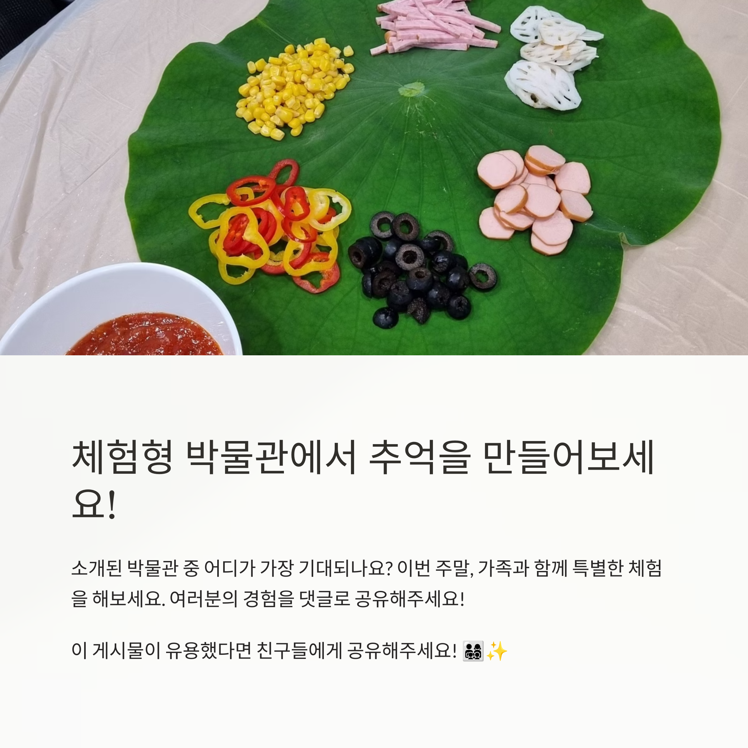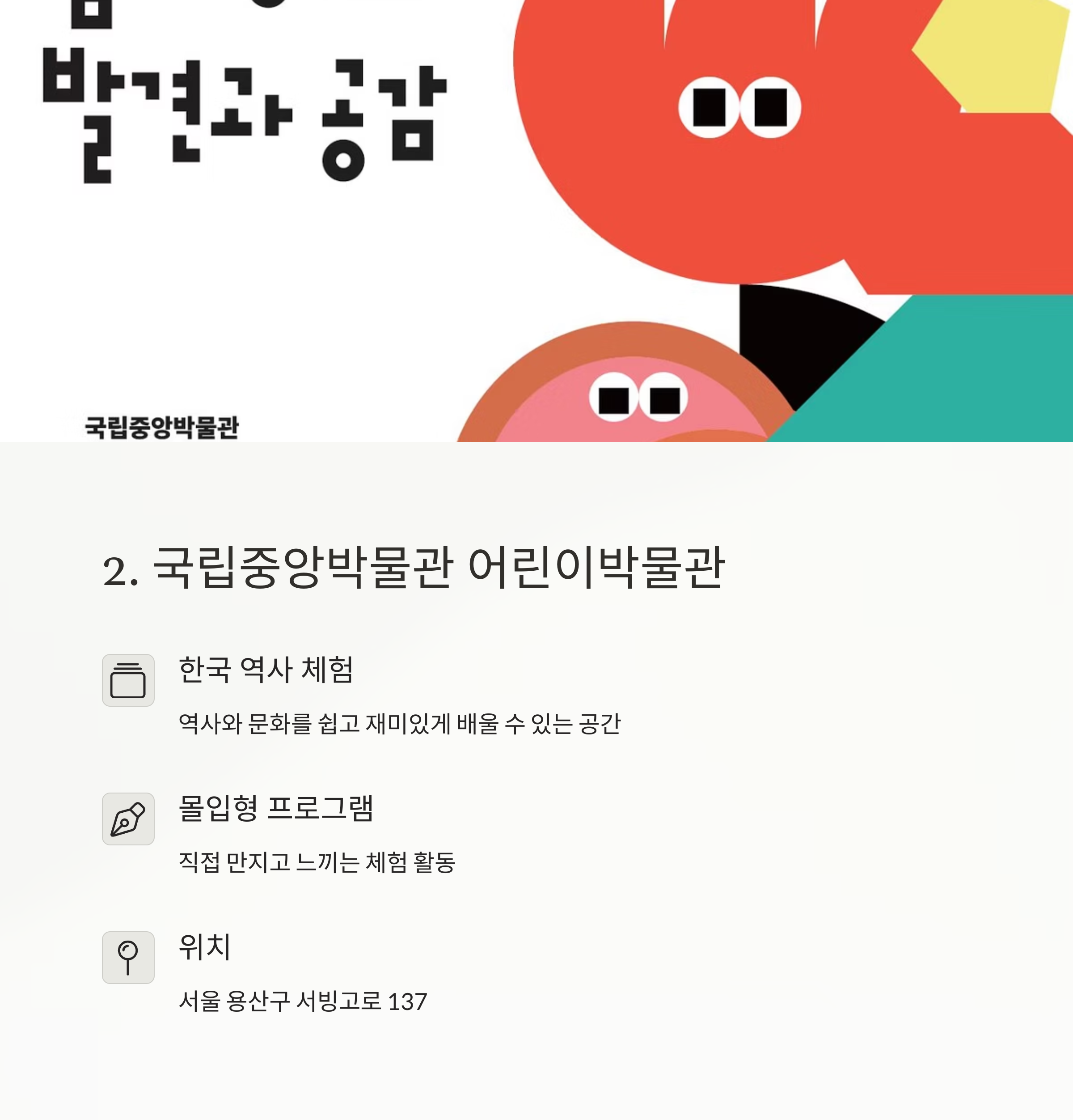 아이와 함께 다녀온 박물관 중 인상 깊었던 곳이 있다면 댓글로 공유해주세요! 방문 팁이나 체험 포인트도 함께 남겨주시면 다른 가족들에게 큰 도움이 됩니다 :)