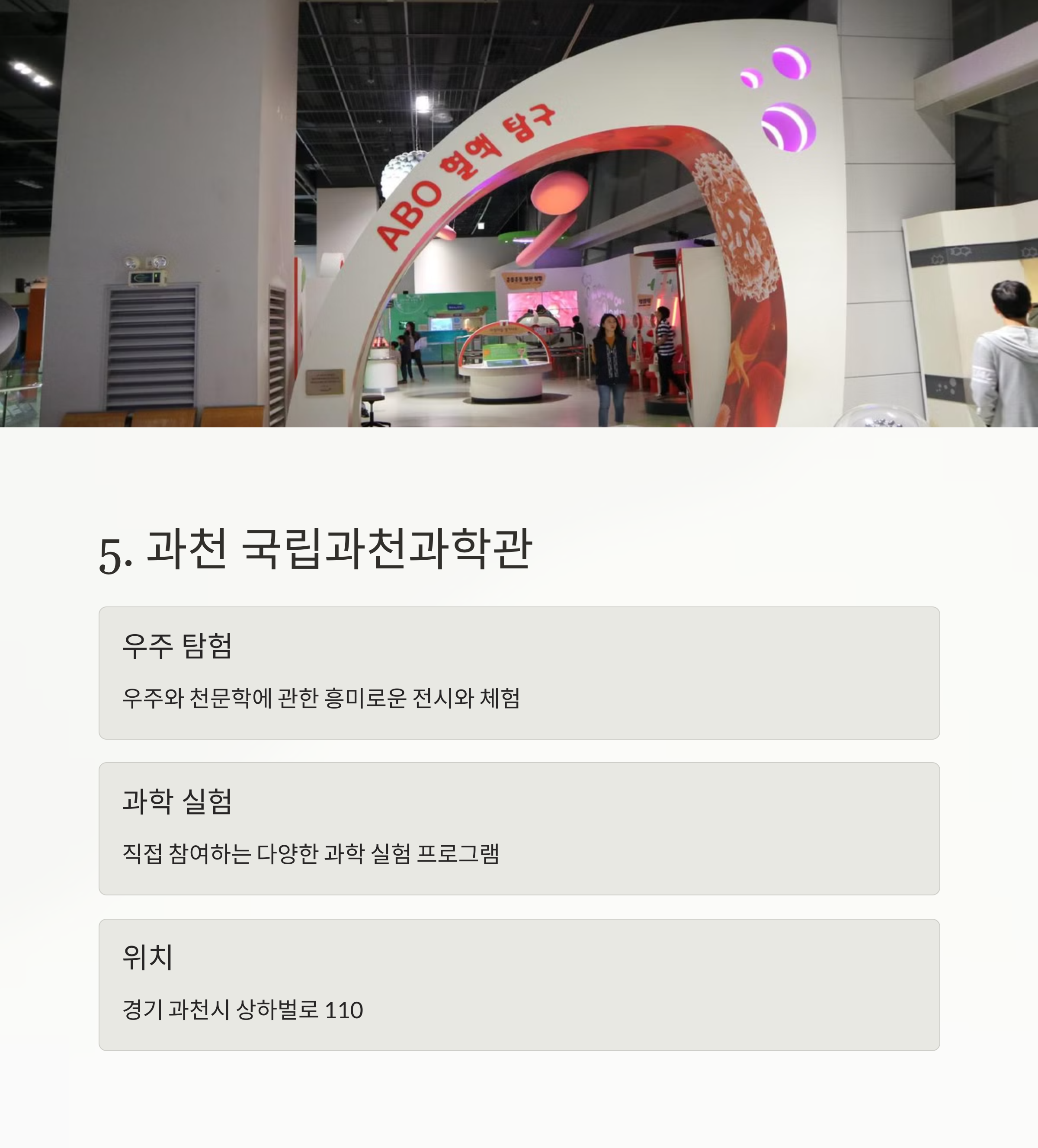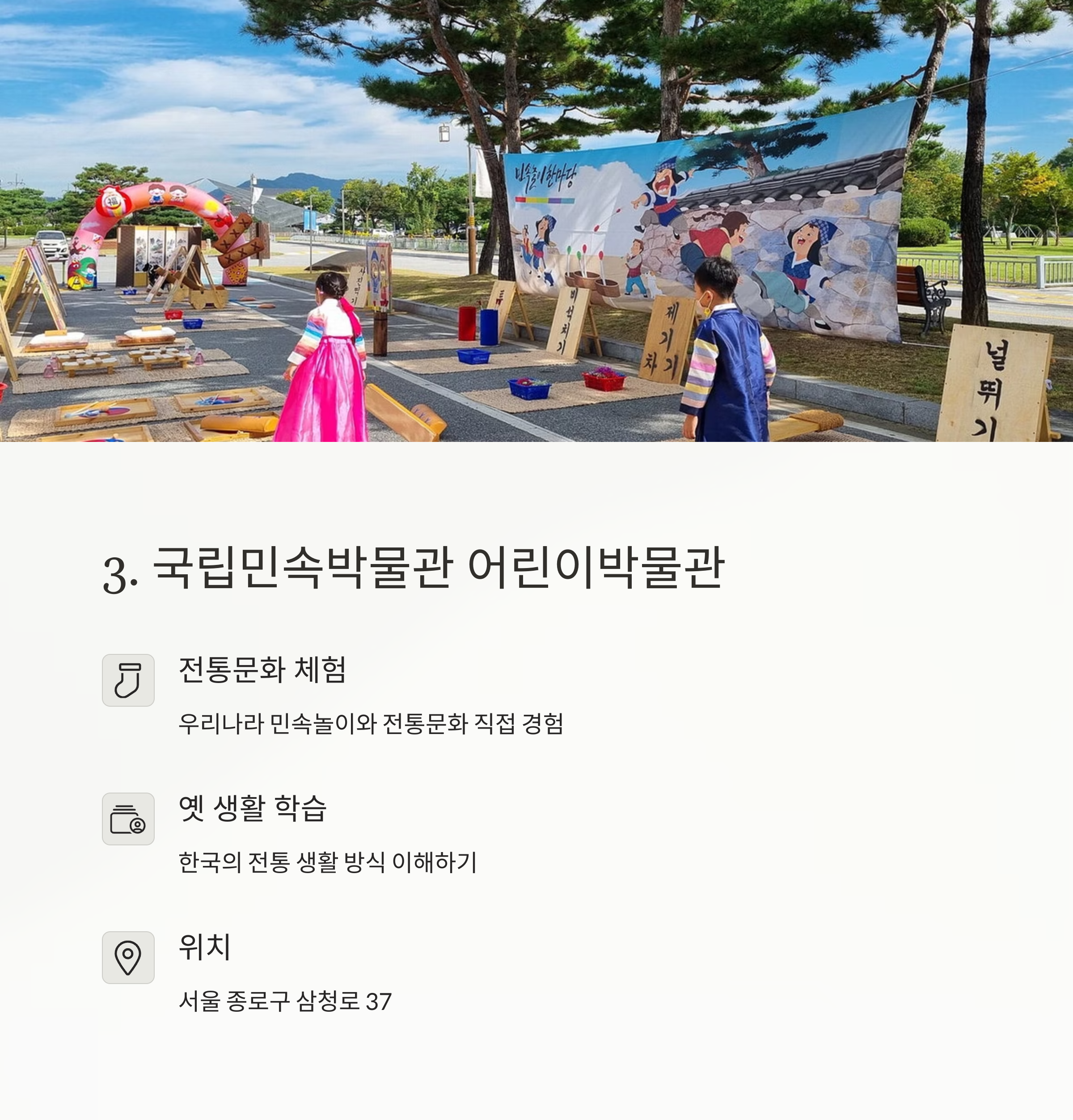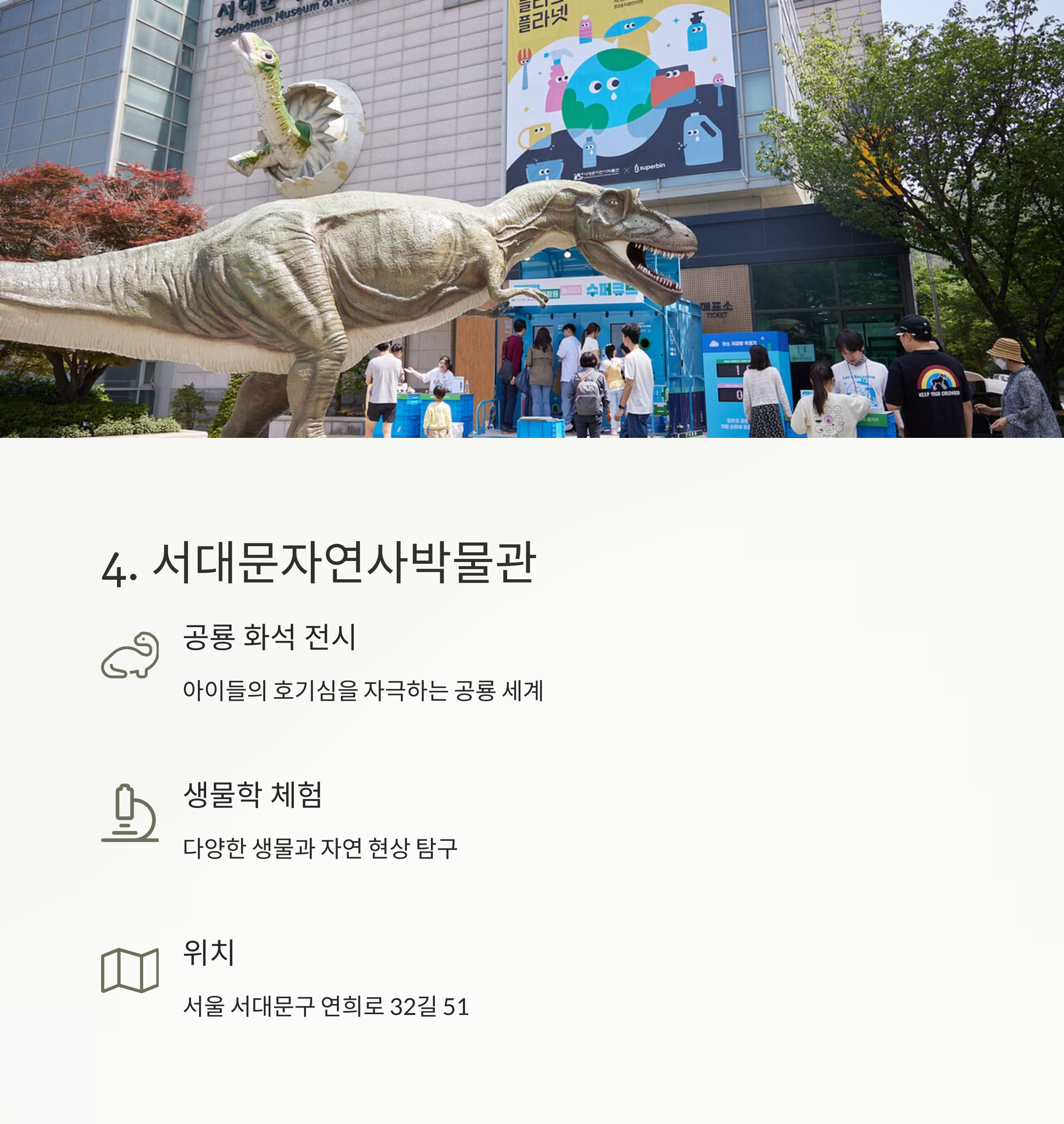 | 서울상상나라, 고양·인천 어린이박물관, 민속박물관 등 추천! | 국립과천과학관, 자연사박물관은 공룡·우주·화석 등 흥미 만점 | 키자니아, 한글박물관, 전쟁기념관 어린이관 등 체험 중심 전시 풍부 |