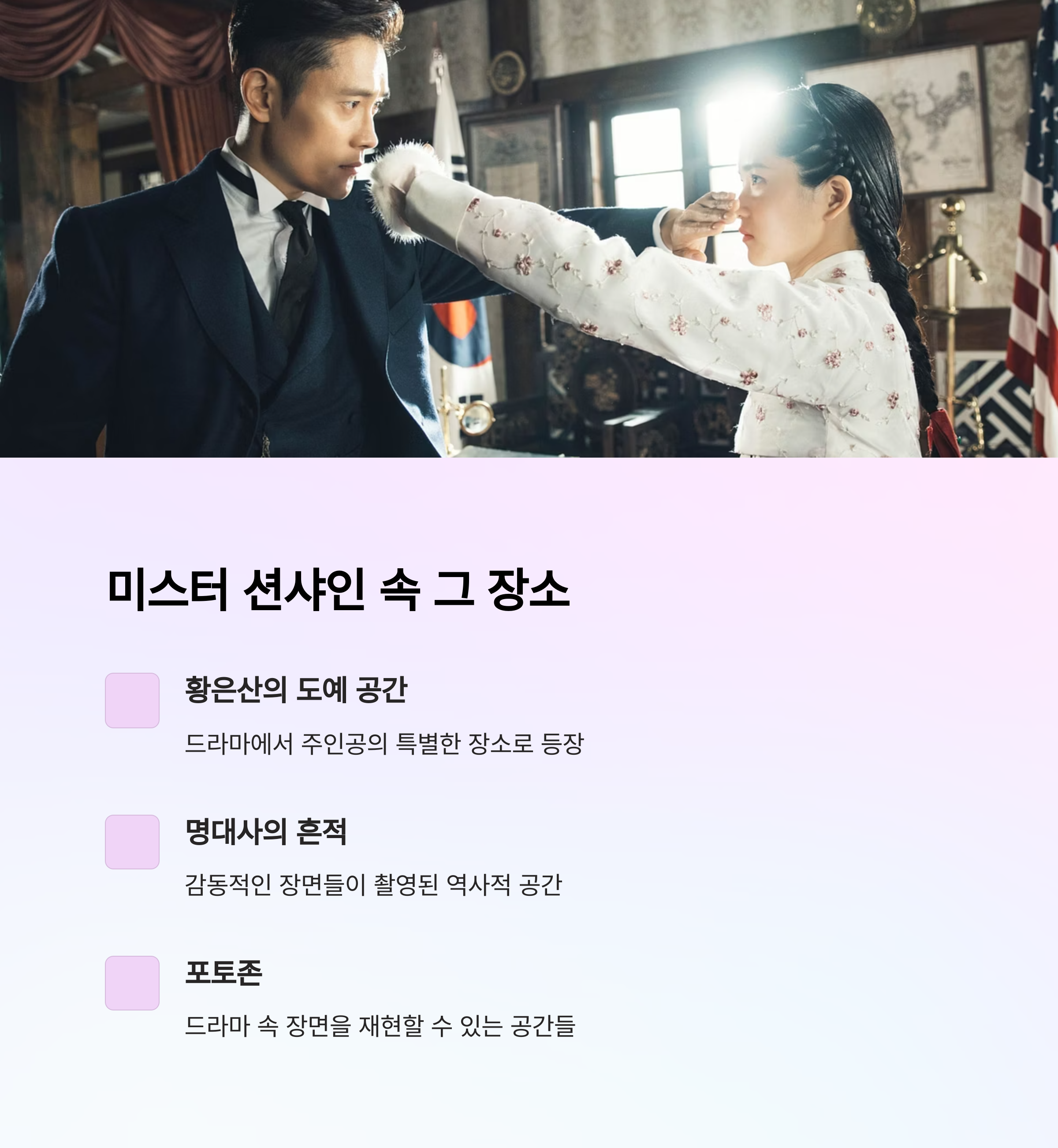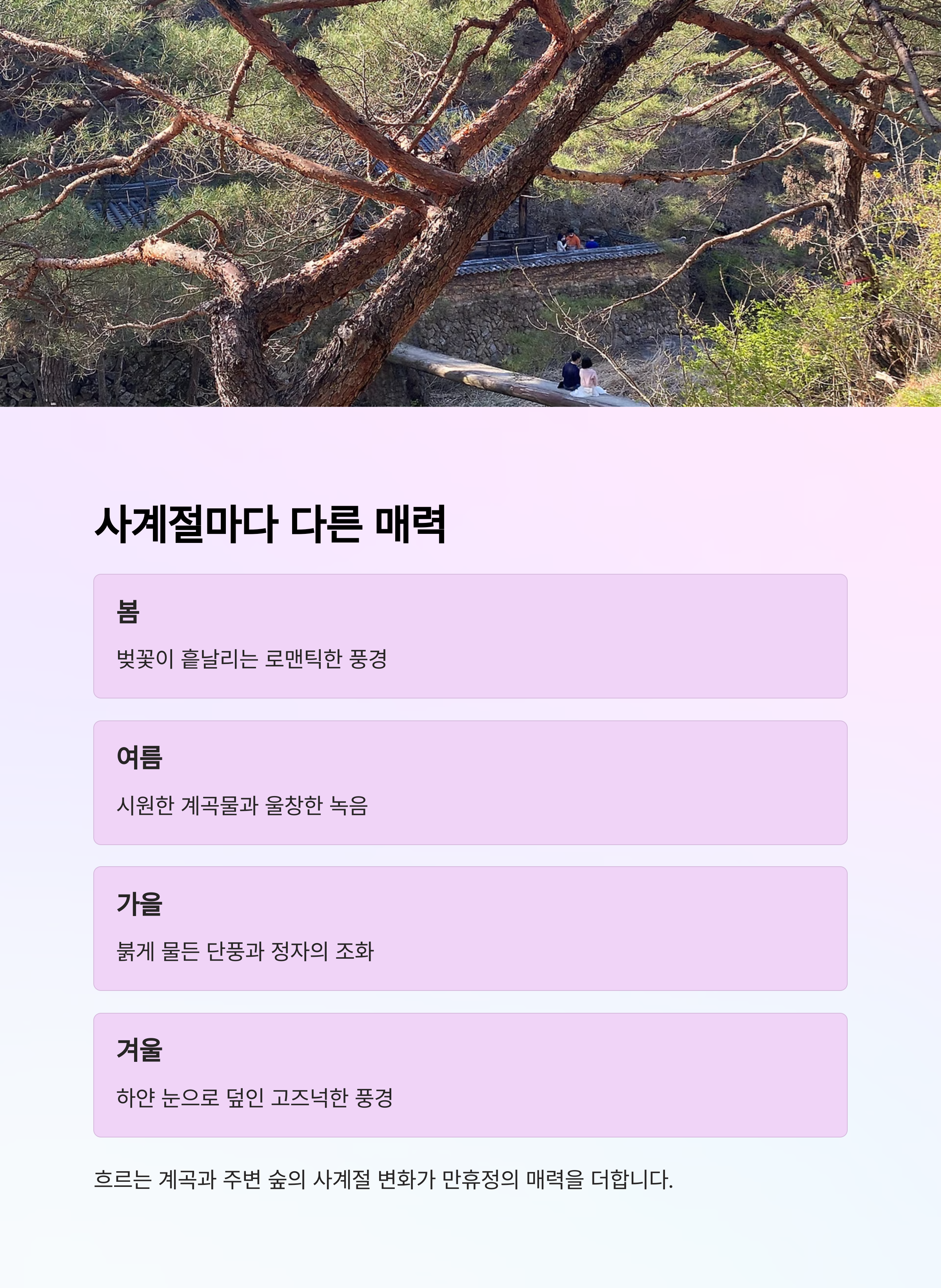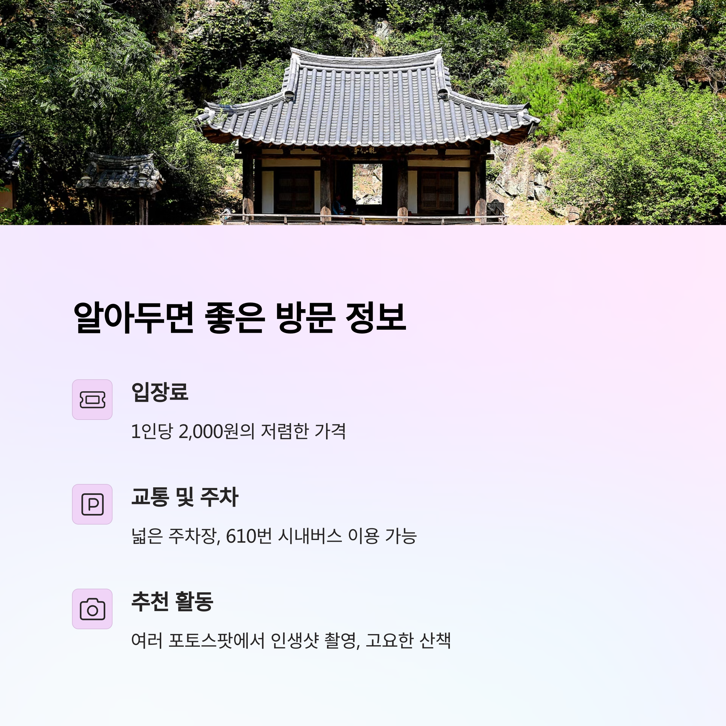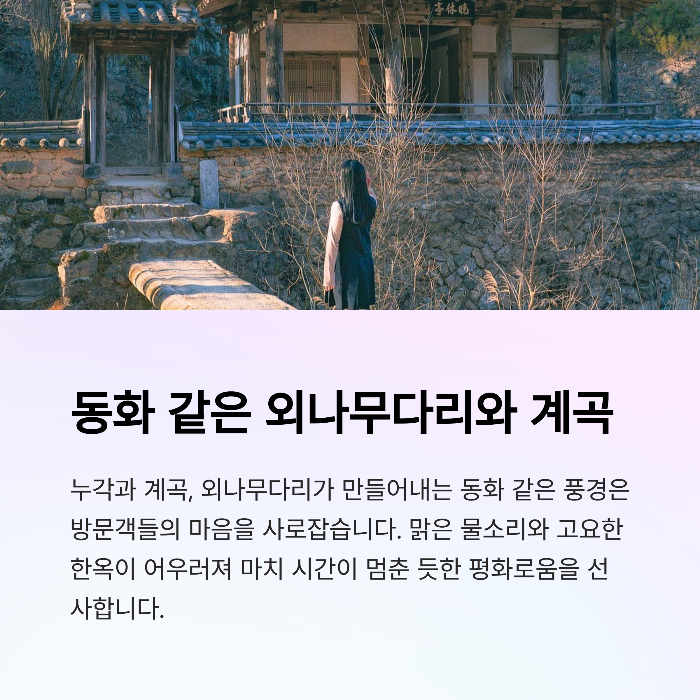 | 특징 요약 | 미스터 션샤인 촬영지, 외나무다리, 계곡, 고요한 정자, 입장료 2천원, 봄·가을 풍경 추천 |