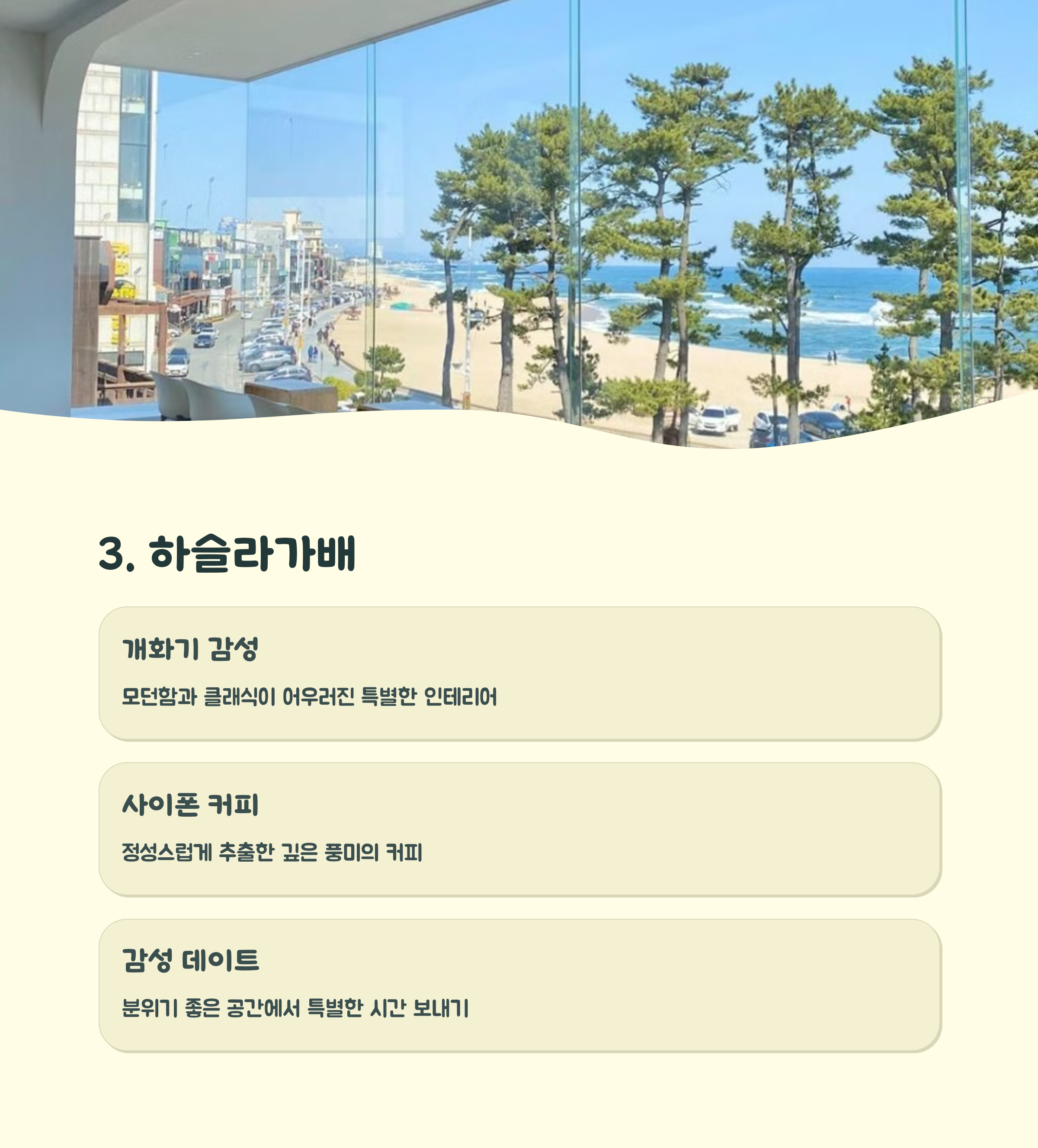 하슬라가배는 개화기 분위기의 감성 인테리어와 사이폰 커피, 잔잔한 오션뷰가 어우러진 공간입니다. 이곳에서는 시간이 멈춘 듯한 여유를 느낄 수 있어 혼자만의 사색을 즐기기에도 좋습니다. 카페 뤼미에르는 깔끔하고 조용한 분위기 속에서 통창 너머로 동해를 감상할 수 있어 여행 중 한 템포 쉬어가기 좋은 장소입니다. 특히 1인 여행자들에게 인기가 많으며, 창가 자리에 앉아 커피 한 잔과 책 한 권이면 완벽한 휴식이 됩니다.