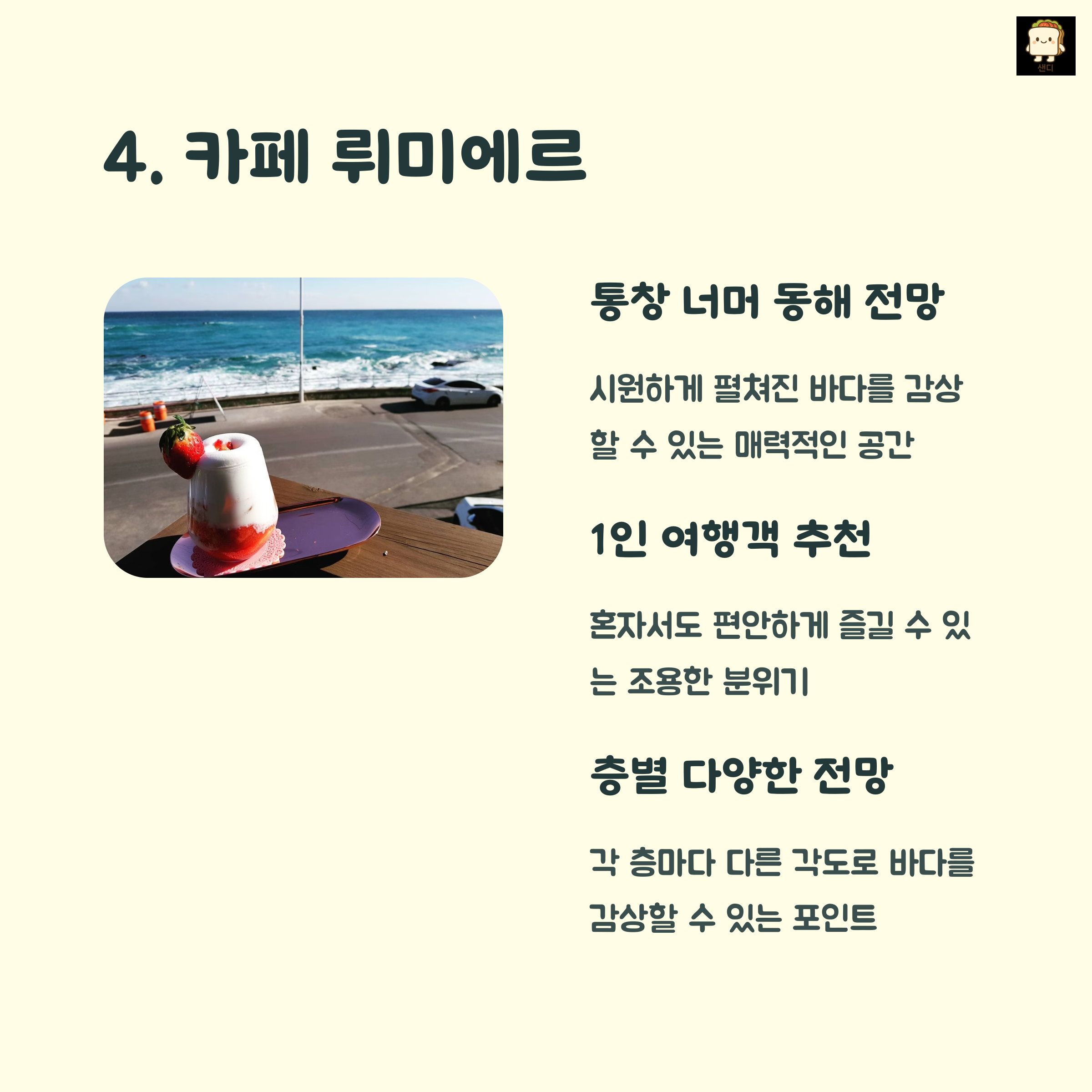 | 해변 산책과 함께 즐기기 좋은 디저트 카페 | 혼자 여행하는 이들에게도 안성맞춤 | 감성 사진과 분위기를 모두 담을 수 있는 곳 |
