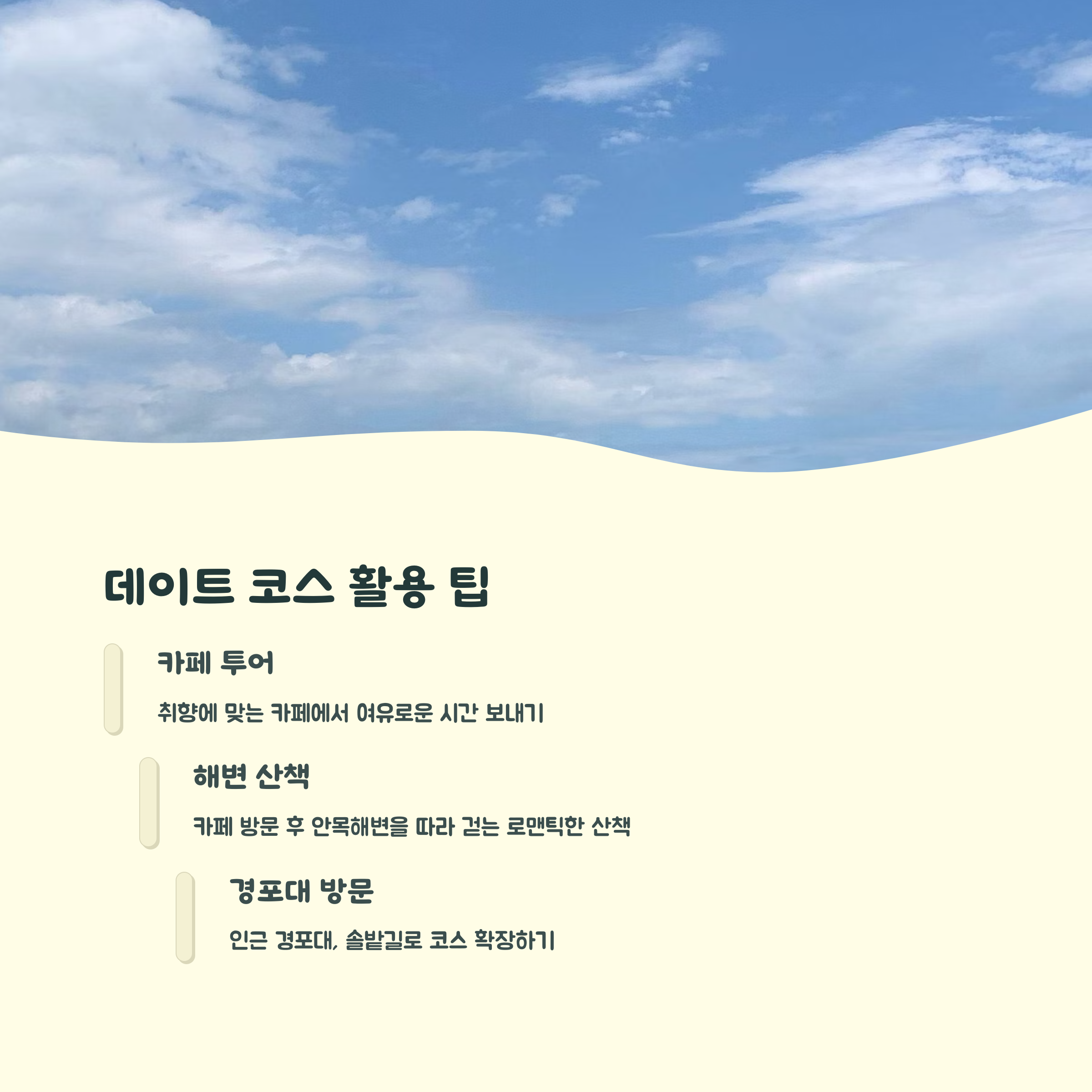 강릉 안목해변 카페거리는 단순한 커피 한 잔을 넘어서, 그 공간 자체가 여행의 목적이 되는 특별한 장소입니다. 각기 다른 매력을 가진 다섯 곳의 카페를 여유롭게 둘러보며 바다와 하늘, 커피가 주는 감성을 만끽해 보세요. 여기에 경포대나 해변 산책까지 더한다면 당신의 하루는 완벽하게 채워질 것입니다. 다음 여행, 강릉으로 떠나보세요.